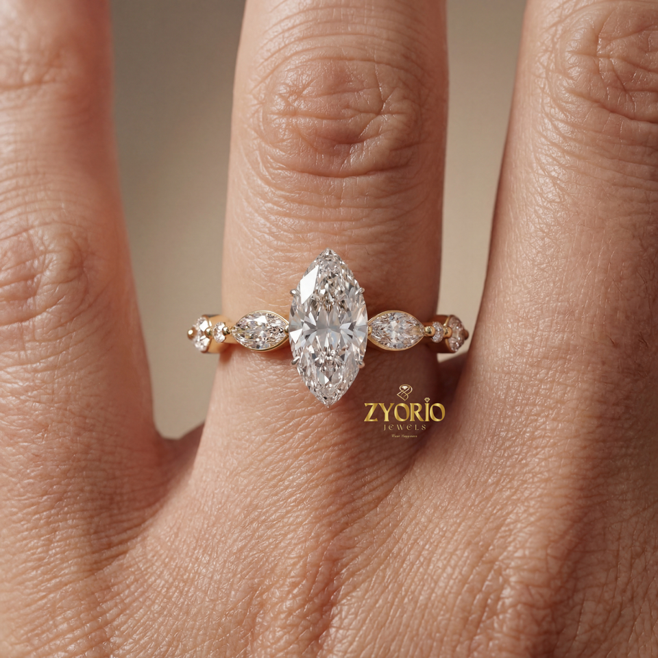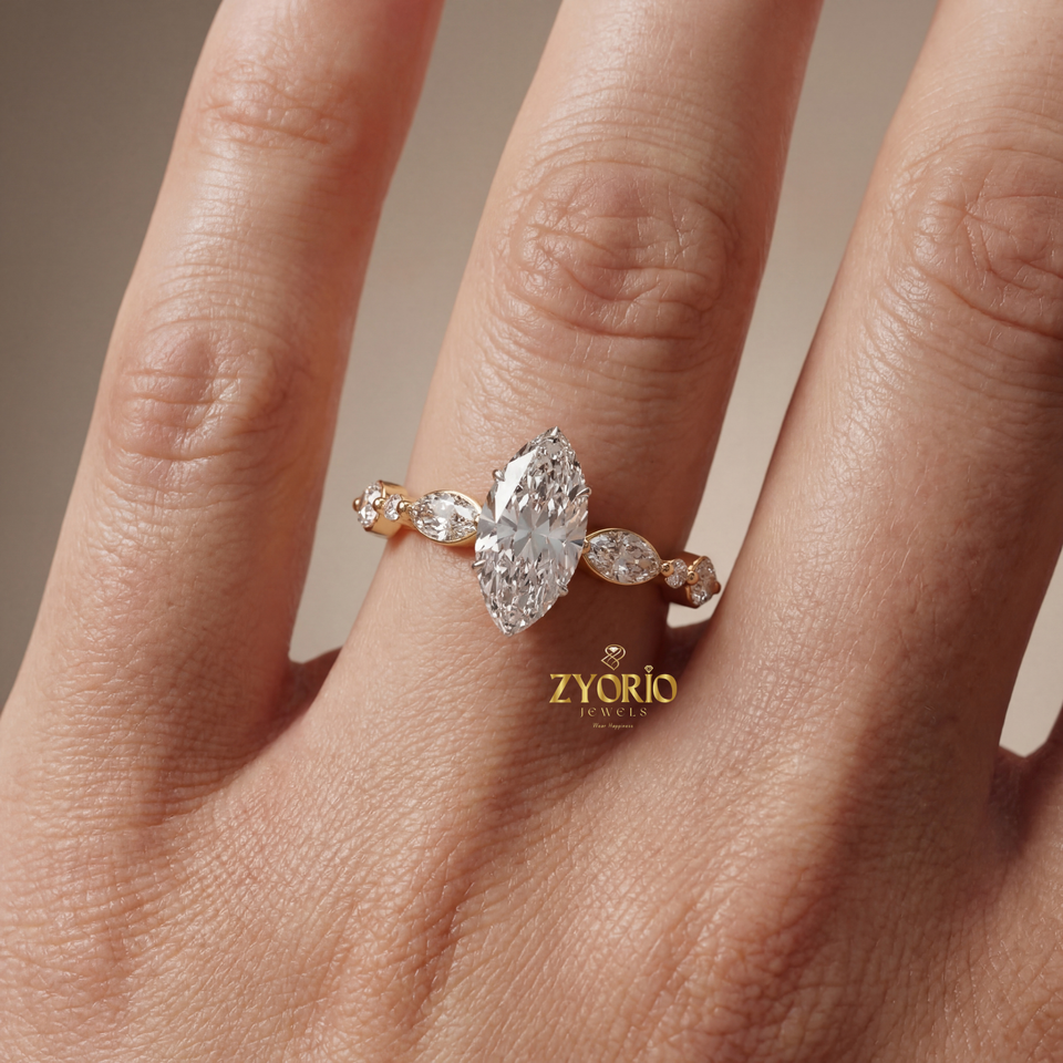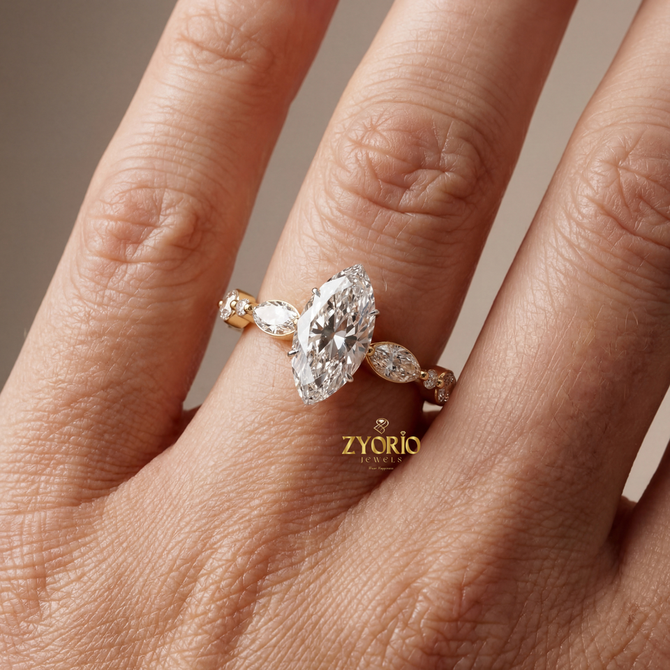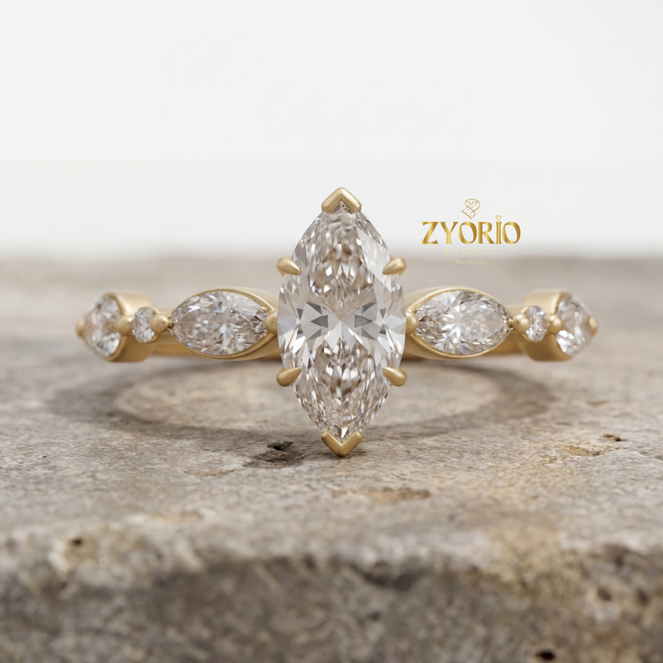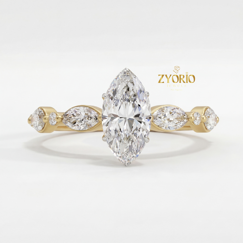 แหวนหมั้นและแหวนแต่งงานเพชรทรงมาร์คีส์ 0.82 กะรัต พร้อมเพชรทรงมาร์คีส์และทรงกลมด้านข้าง เงินแท้ 925