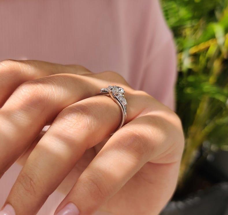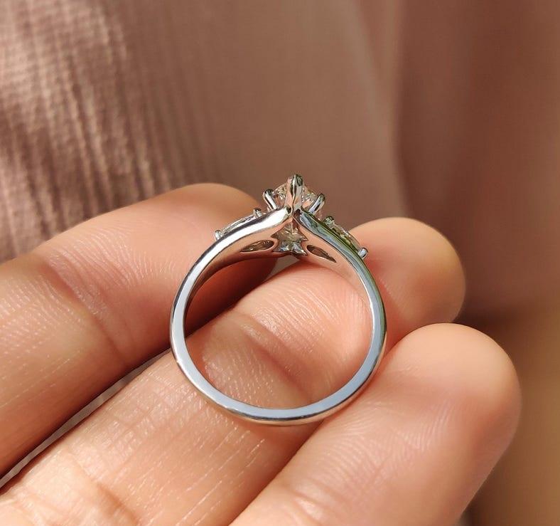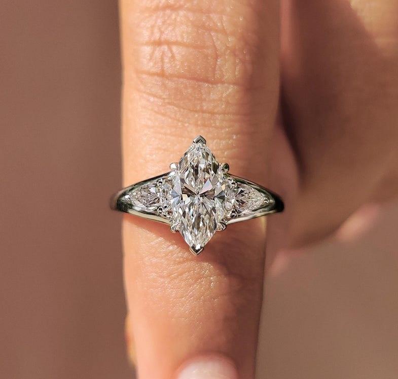 แหวนเพชรทรงมาร์คีส์เพาะเลี้ยงในห้องปฏิบัติการ ประดับเพชรแบบเบเซลเซ็ตในทองคำขาว 14K ดีไซน์เครื่องประดับชั้นดีแบบสามเม็ดสำหรับผู้หญิง