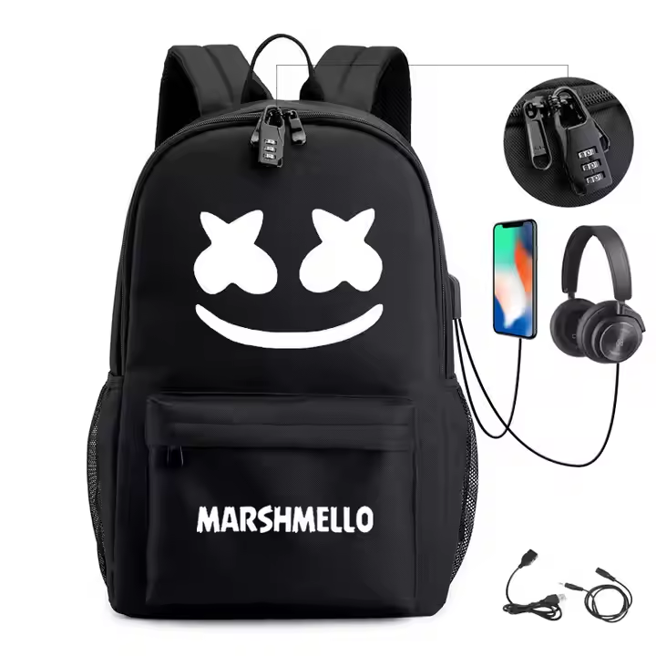 กระเป๋าเป้สะพายหลังมาร์ชเมลโล่ฮิปฮอปแบบซับลิเมชันเครื่องชาร์จ USB แบบเรืองแสงชุดกระเป๋านักเรียนกันขโมยแบบกำหนดเองมีซิปโพลีเอสเตอร์ซับใน