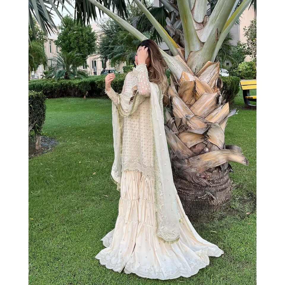 ชุดสูทปาร์ตี้สีเบจสำหรับผู้หญิง แบรนด์มารูติ แฟชั่น ดีไซเนอร์ พร้อมเสื้อปักลาย กางเกงปักลาย และผ้าคลุมไหล่ปักลาย ไซส์ M