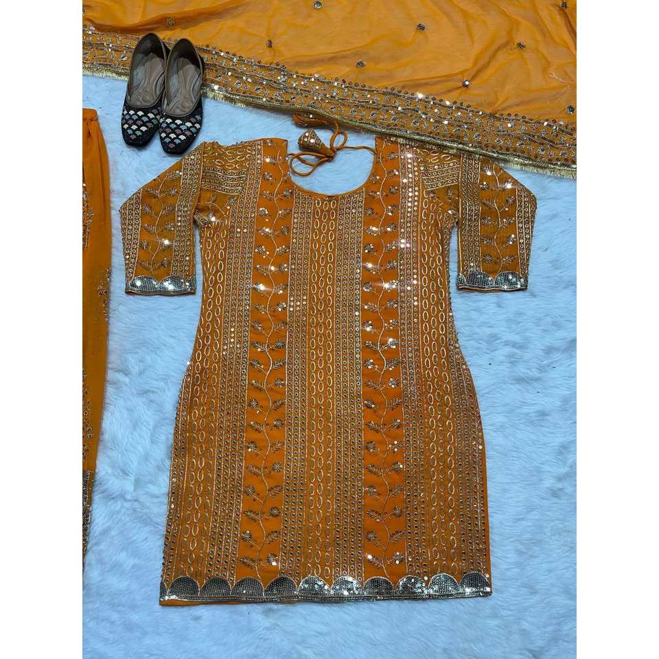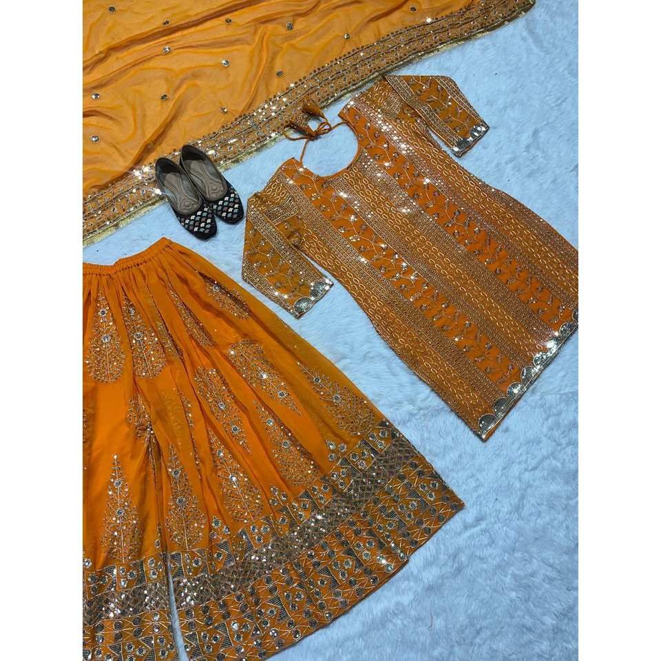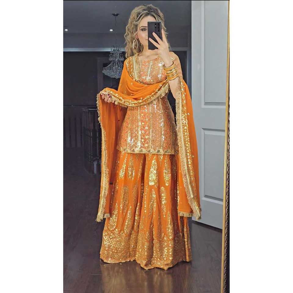 ชุดเสื้อและกางเกงพลัสโซ่สำหรับงานปาร์ตี้ของผู้หญิง ดีไซน์เนอร์ Maruti Fashion สีส้ม พร้อมผ้าคลุมไหล่ งานปักอย่างประณีต ให้ลุคหรูหรา