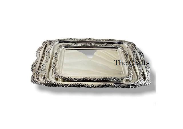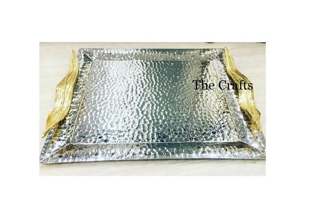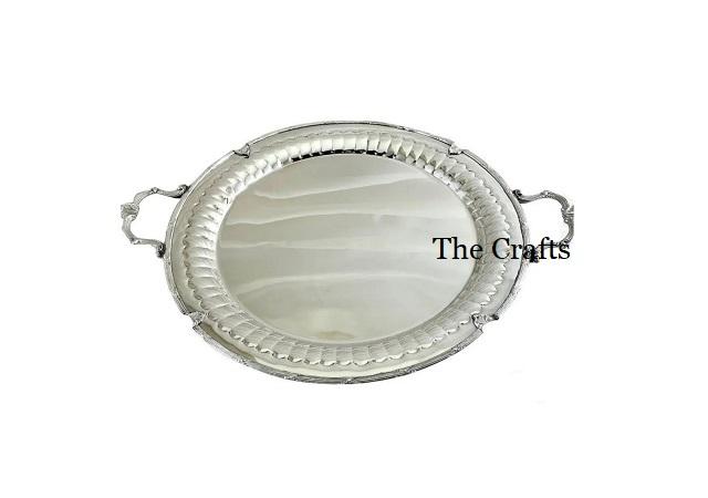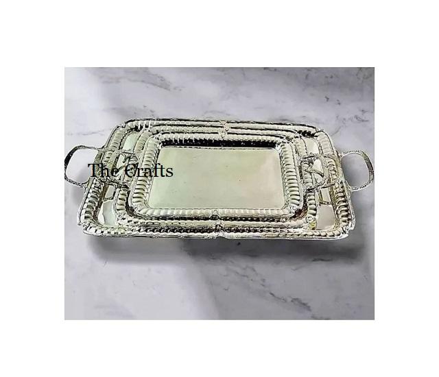 ถาดเสิร์ฟสแตนเลสสีเงินพร้อมหูจับลายใบไม้ สำหรับใส่อาหาร ขนมหวาน ช็อคโกแลต