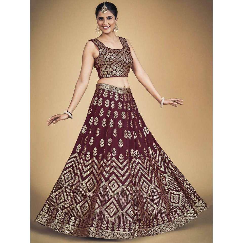 ชุดเลเฮนกาโชลีผ้าจอร์เจตต์ปักเลื่อมสีแดงเลือดหมูสุดอลังการ สำหรับงานเทศกาลและงานแต่งงาน