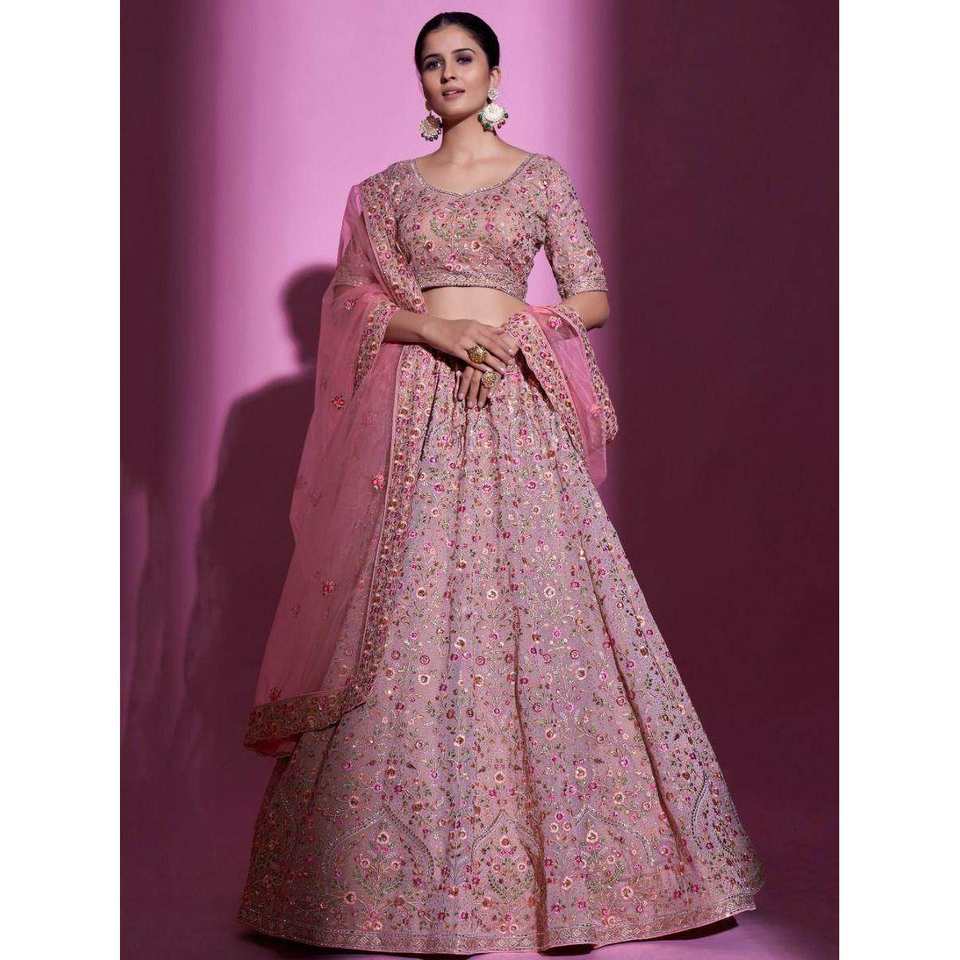 ชุดเลเฮนกาโชลีงานแต่งงานผ้าจอร์เจตต์ปักลายพีชสวยงาม
