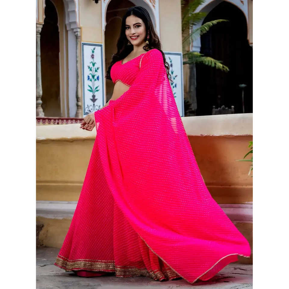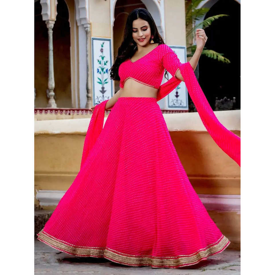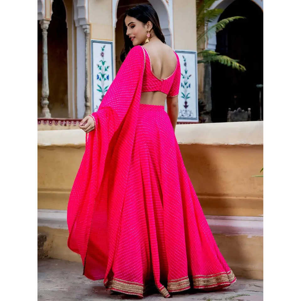 ชุดเลเฮนกาโชลีผ้าจอร์เจตต์พิมพ์ลายลาเฮริยาสีชมพูสวยงามสำหรับงานแต่งงาน
