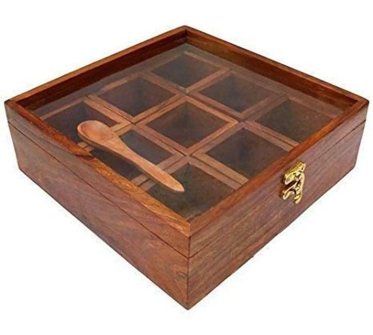 กล่องมาซาลา กล่องเครื่องเทศไม้สี่เหลี่ยมทำมือ กล่องใส่เครื่องปรุงรสไม้