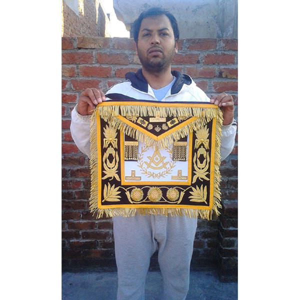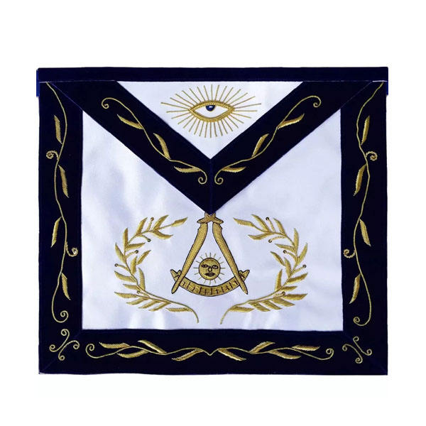 ผ้ากันเปื้อนมาสเตอร์บลูลอดจ์ ของสมาคมฟรีเมสัน ทำจากกำมะหยี่สีน้ำเงิน ปักลายด้วยดิ้นทอง สำหรับพิธีกรรม ปักลายด้วยมือ ปี 2026