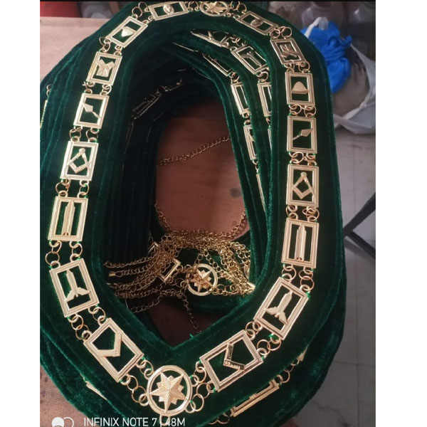 ผ้ากันเปื้อนเครื่องราชกกุธภัณฑ์ที่ทำจากหินสีเขียวเข้มปกคอเสื้อแผ่นปะลายอิฐที่มีการตกแต่งด้วยเลื่อมเข็มกลัดติดได้
