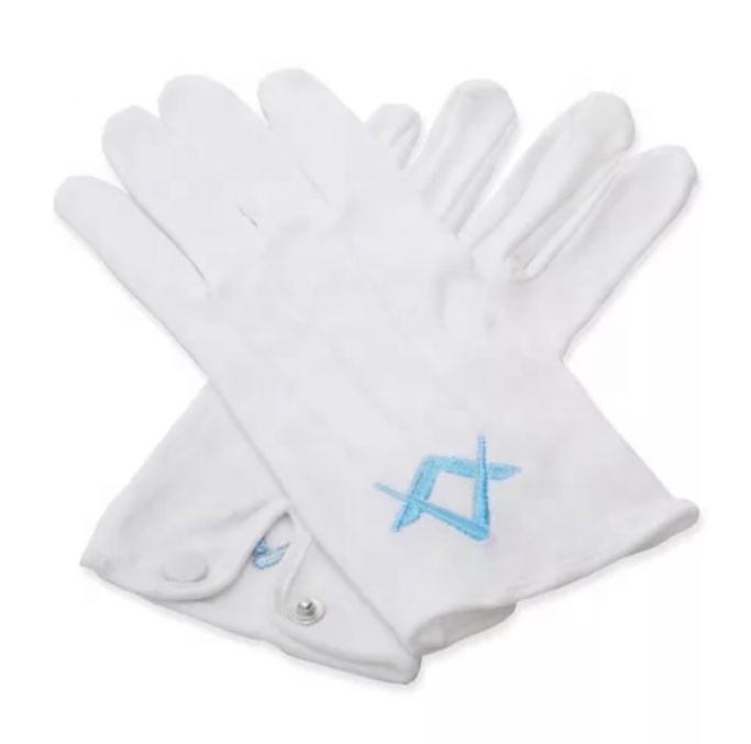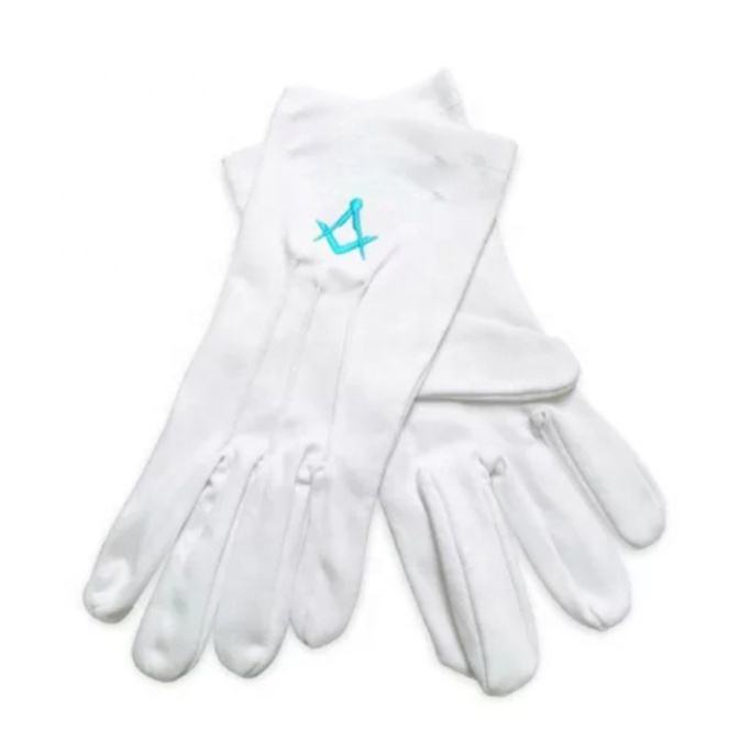 ถุงมือผ้าฝ้ายสีเหลืองแบบกำหนดเอง สวมใส่สบายได้ทุกฤดู สำหรับพิธีกรรมเมสัน ปักลายทองรูปเข็มวงเวียนและเข็มทิศ สำหรับใช้ในชีวิตประจำวัน