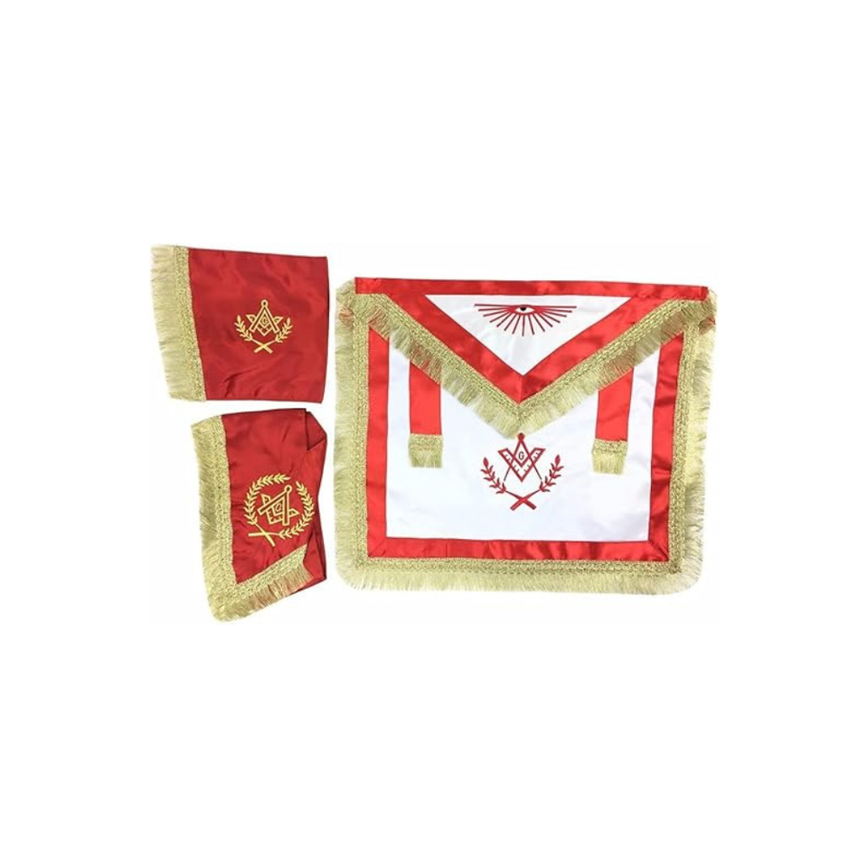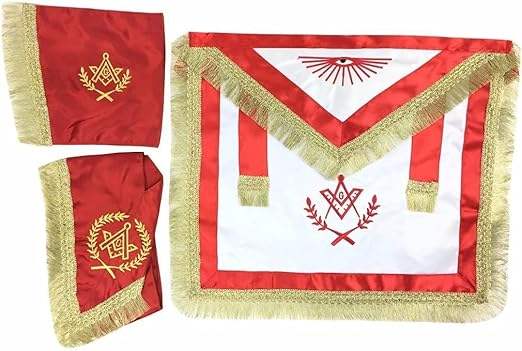 ชุดเครื่องราชอิสริยาภรณ์มาสเตอร์เมสัน บลู ลอจ รีกาเลีย สีแดงและสีขาว ผ้าซาติน พร้อมผ้ากันเปื้อนแบบเต็มตัว รอยัล อาร์ช ด้านหลังสีน้ำเงิน