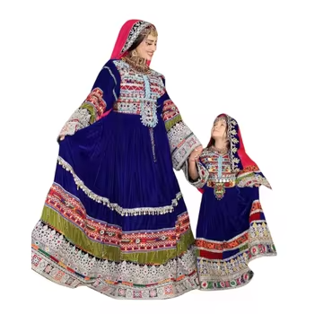 ชุดเดรสแบบดั้งเดิมของชาวอัฟกันกุจิสำหรับแม่และลูกสาว สีน้ำเงินเข้ม พร้อมงานปักหนัก ประดับกระจก และสีสันสดใส