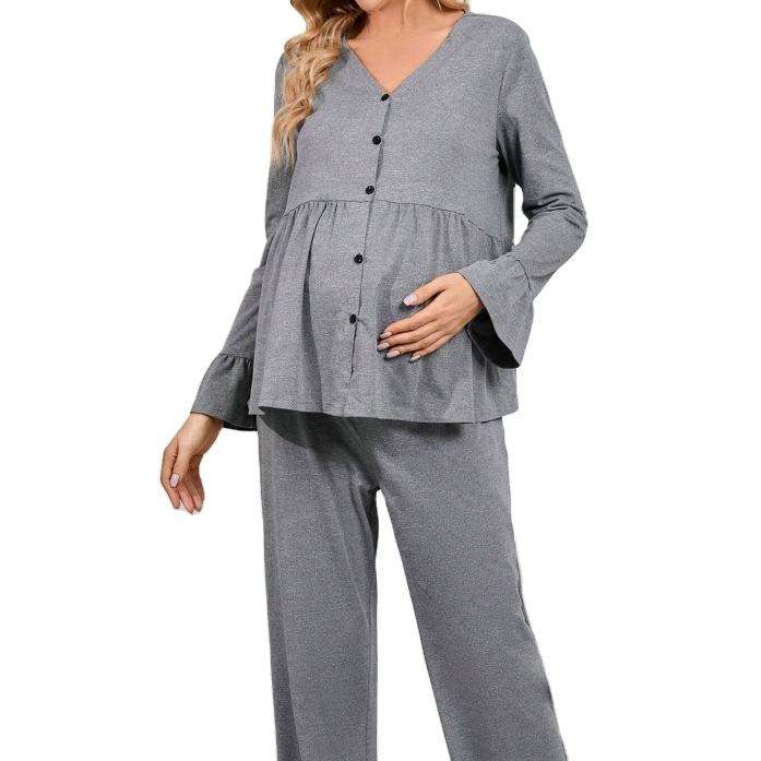 ชุดนอนคนท้อง เสื้อคลุมเปปลัมติดกระดุมด้านหน้า กางเกงขายาวเอวปรับได้ ชุดนอนสำหรับหญิงตั้งครรภ์ ชุดคลุมท้อง
