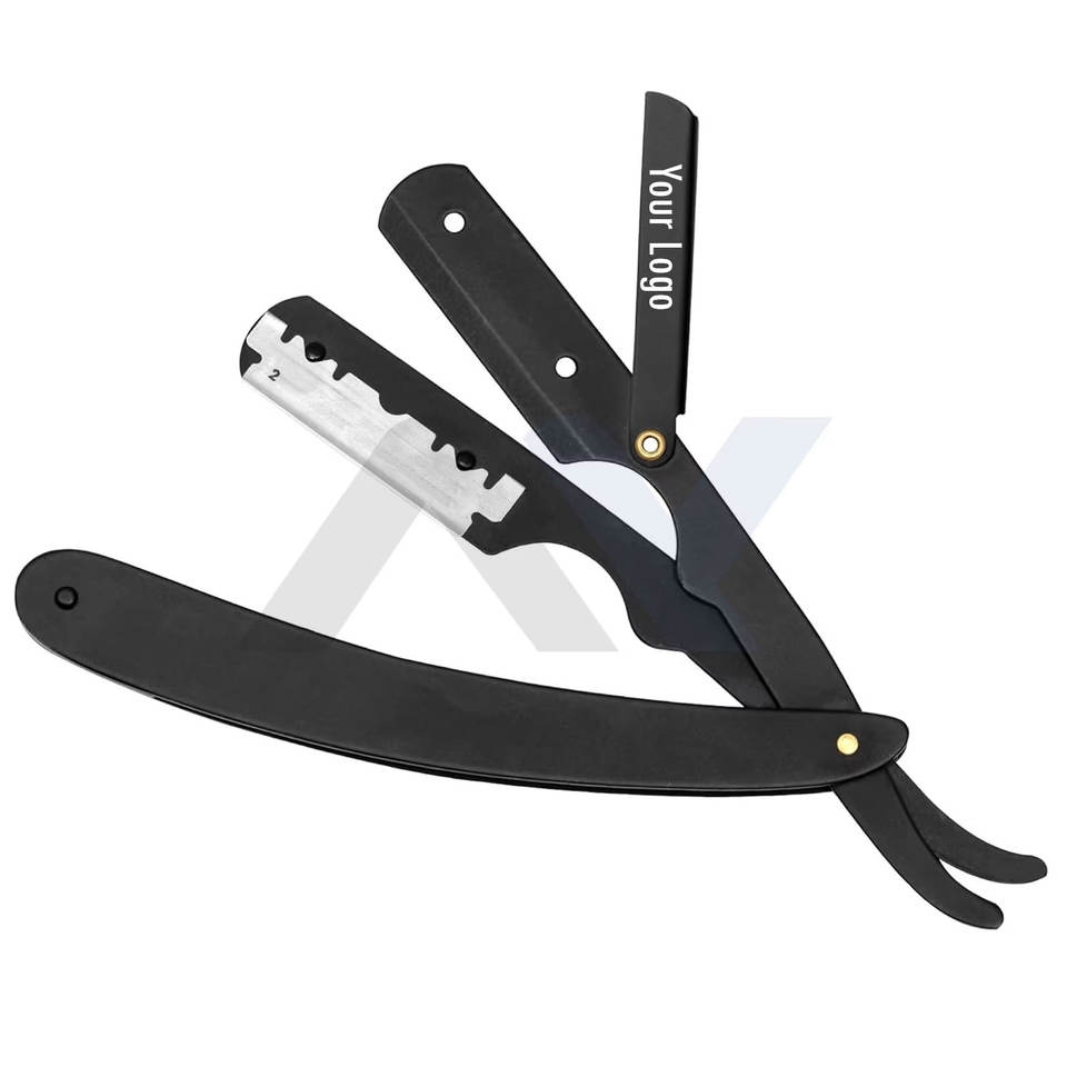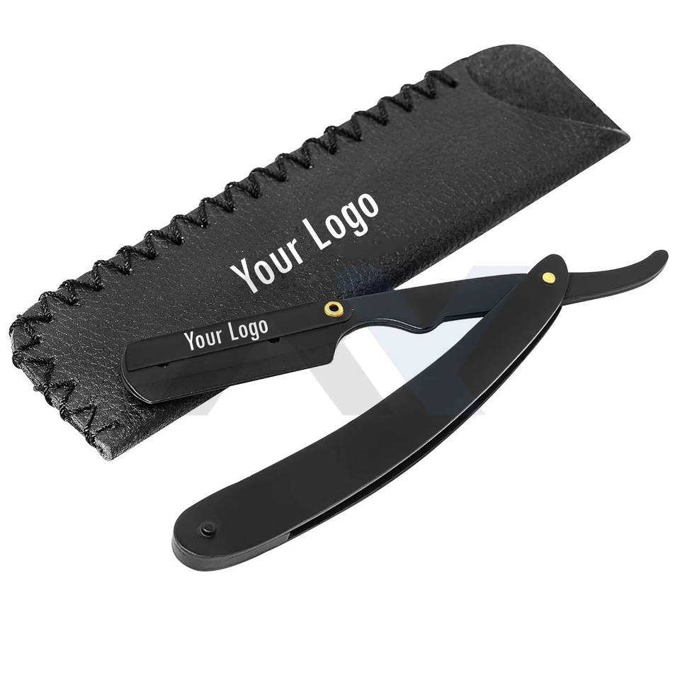 มีดโกนหนวดแบบตรง สีดำด้าน สแตนเลสสตีล พร้อมซองหนัง ราคาถูก รับทำโลโก้ OEM