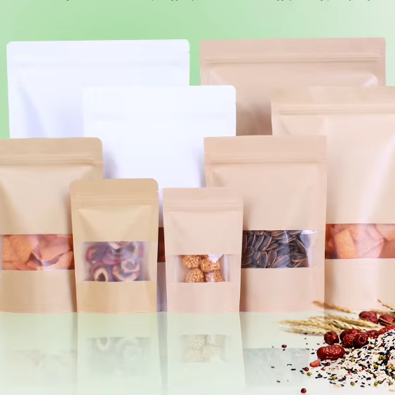 ถุงซิปกระดาษคราฟท์เกรดอาหารแบบตั้งมีโลโก้แบบกำหนดเองสำหรับบรรจุอาหารถั่วขนมขบเคี้ยว