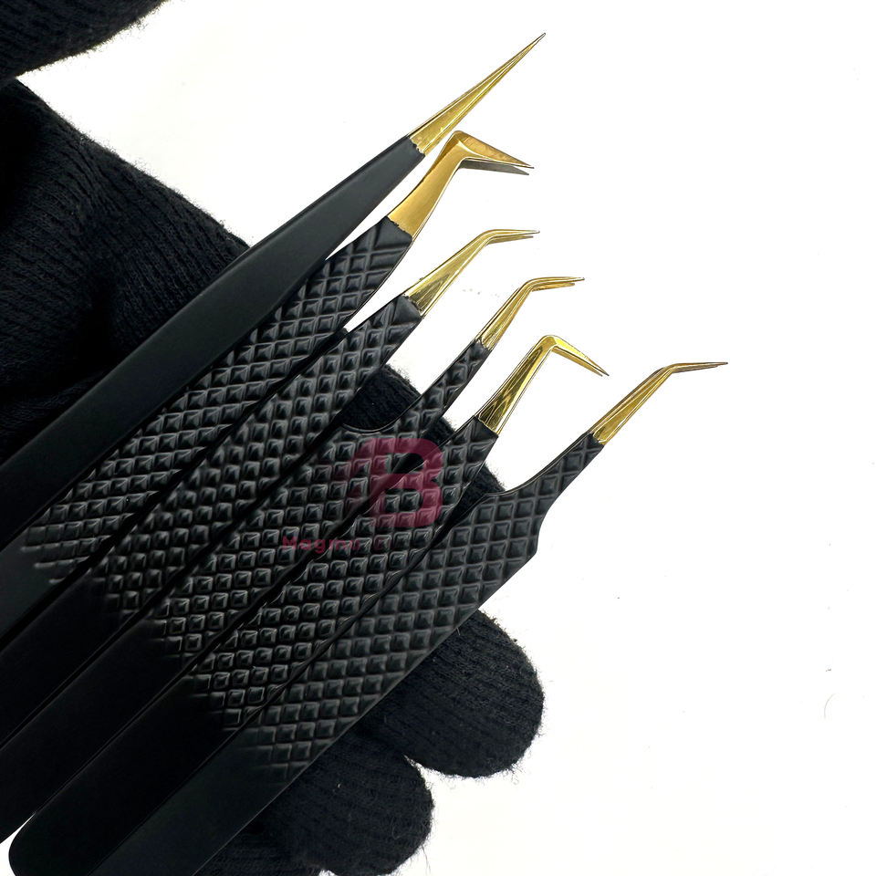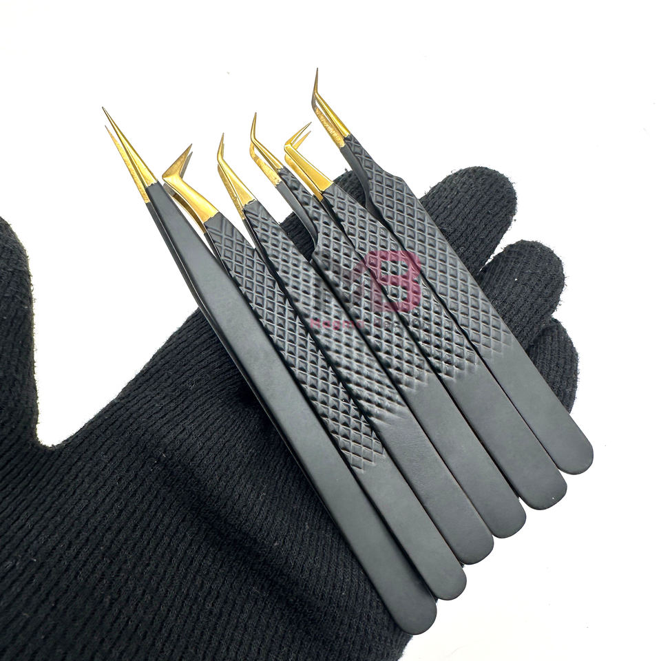 แหนบต่อขนตาเคลือบสีดำด้าน ปลายสีทอง ด้ามจับแบบเพชร ผลิตภัณฑ์สั่งทำพิเศษ ผลิตจากเหล็กกล้าไร้สนิมญี่ปุ่น
