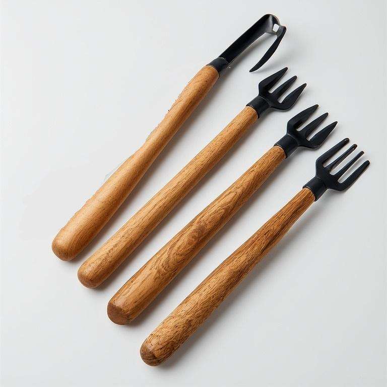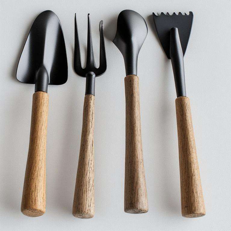 ชุดเครื่องมือทำสวนสีดำด้าน พร้อมด้ามไม้ ประกอบด้วยพลั่ว คราด และจอบสำหรับปลูกต้นไม้