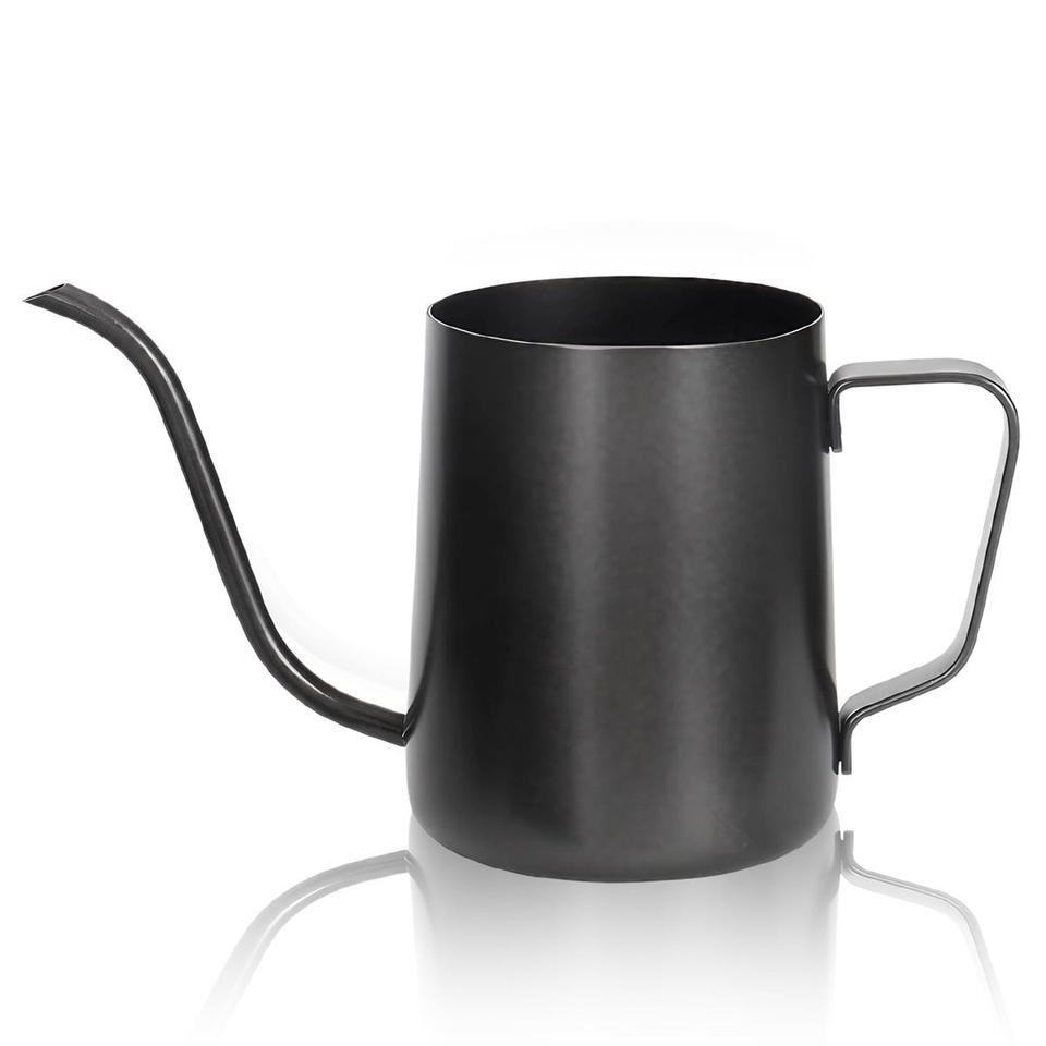 บัวรดน้ำทรงกลมสีดำด้านมีพวยโค้งยาวและที่จับห่วงสำหรับบ้านในร่ม
