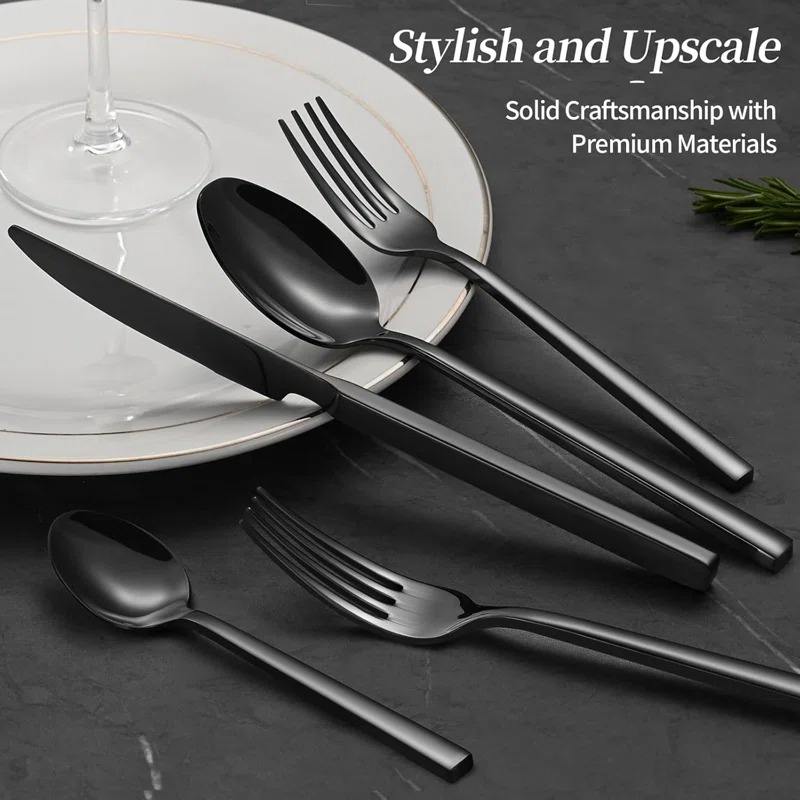 ชุดช้อนส้อมสแตนเลสสีดำด้านเครื่องใช้บนโต๊ะอาหารทันสมัยสำหรับรับประทานอาหารที่หรูหราบ้านห้องครัวงานแต่งงานและร้านอาหาร