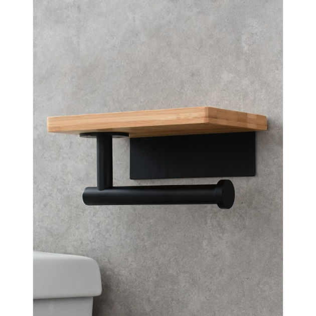 ที่ใส่กระดาษชำระโลหะติดผนังสีดำด้านพร้อมชั้นวางของในห้องน้ำแบบม้วนได้ทันสมัยดีไซน์เรียบง่ายทนทาน