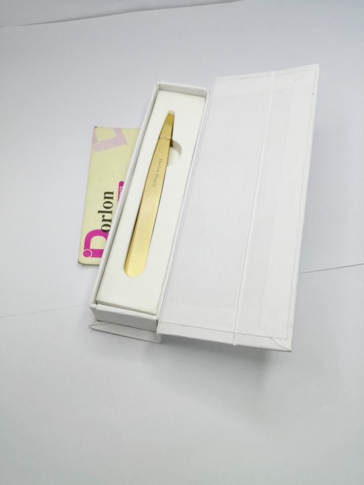แหนบคิ้วแบบเอียงชุบทองเครื่องมือเครื่องสำอางติดฉลากส่วนตัวกล่องใส่การ์ดสีขาวแต่ละใบ