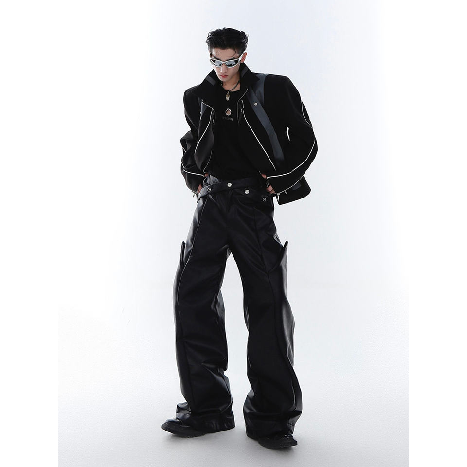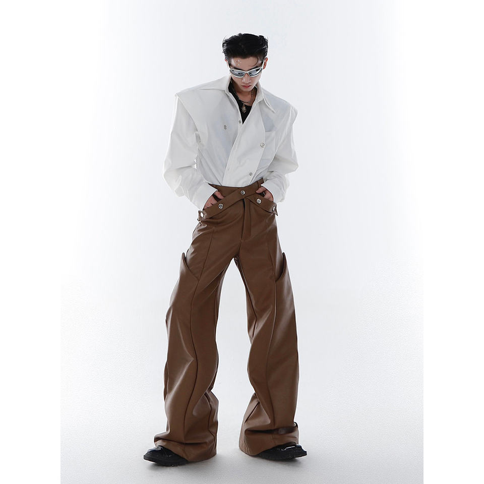 กางเกงขายาวทรงหลวมสไตล์ลำลองสีน้ำตาลดำ หนัง PU สำหรับผู้ชาย แบรนด์หรู ดีไซน์เนอร์ รุ่น Mauroicardi คอลเลคชั่นฤดูใบไม้ผลิ/ฤดูใบไม้ร่วง ปี 2023 รุ่น B
