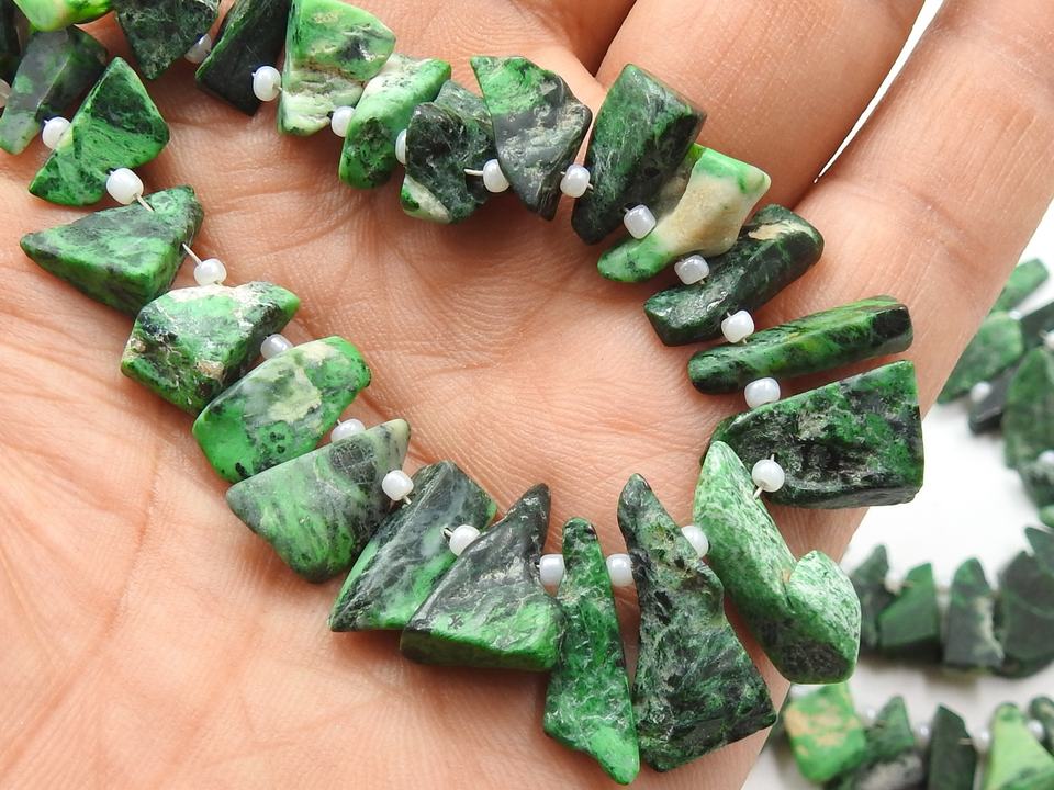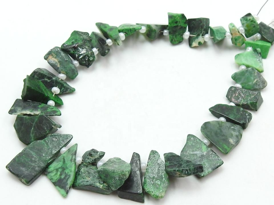 หยกม้าซิทซิท สีเขียวธรรมชาติ ขัดเงาแบบหยาบ ทรงบริโอเล็ต ขนาด 8 นิ้ว ยาวประมาณ 9-15 มม. ได้รับการรับรองจากผู้ที่สาม