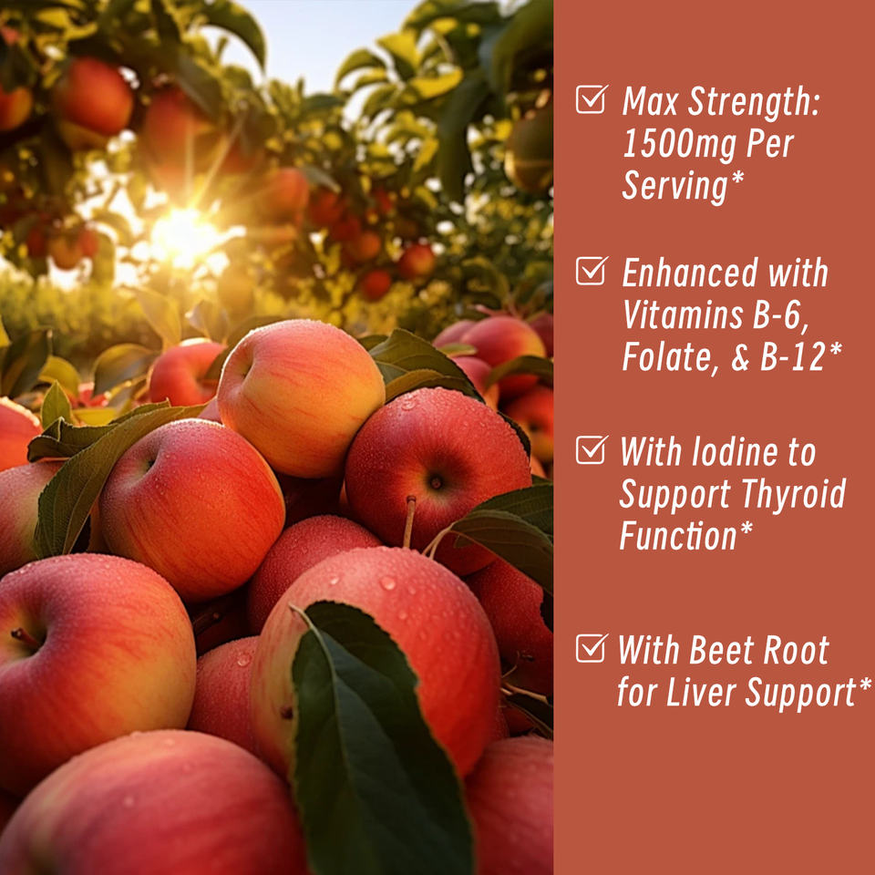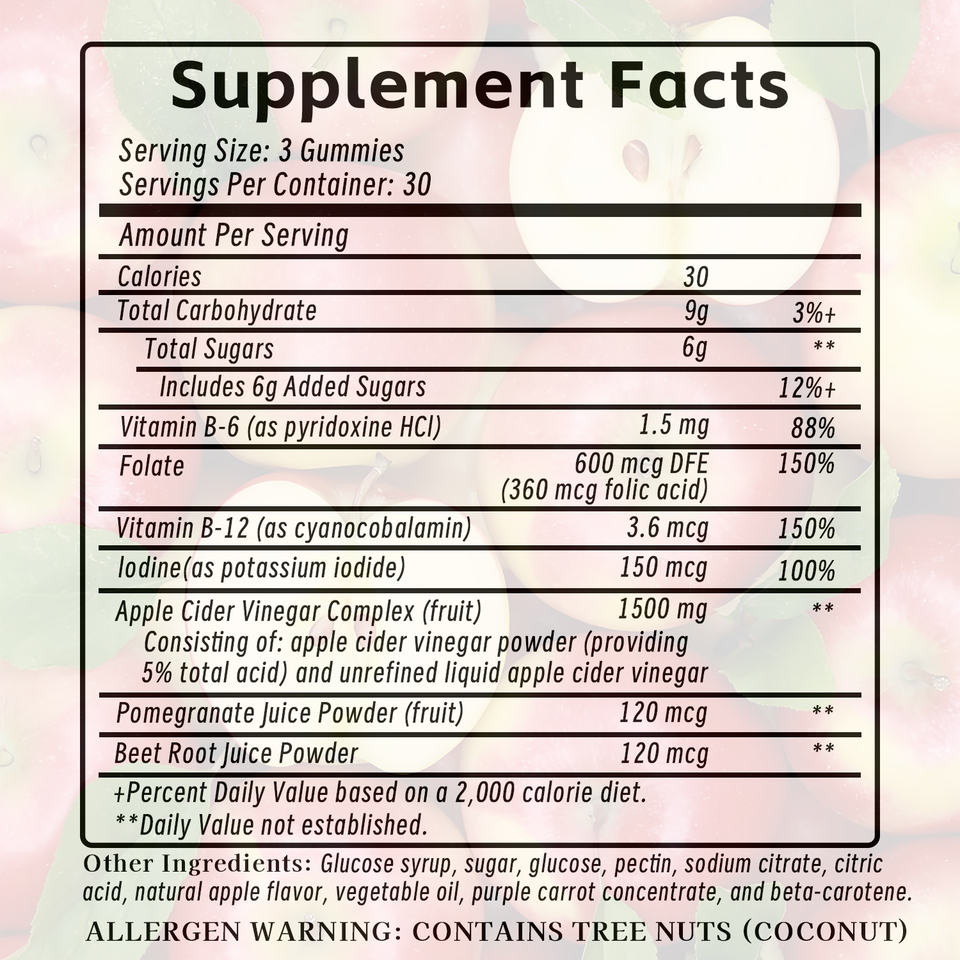 ส่วนผสมหลัก:วิตามิน B-6, โฟเลต, วิตามิน B-12, ไอโอดีน, น้ำส้มสายชูแอปเปิ้ลไซเดอร์ที่ซับซ้อน, ผงน้ำทับทิม, ผงน้ำผลไม้บีทรูท
