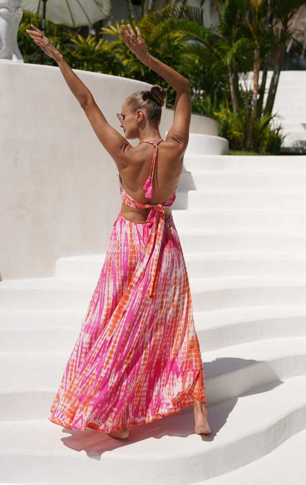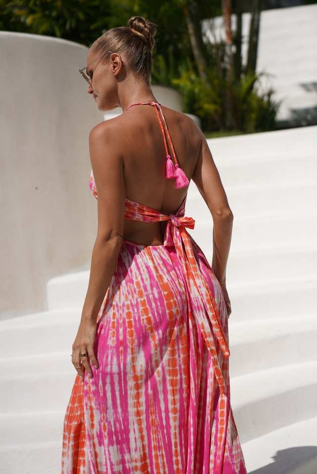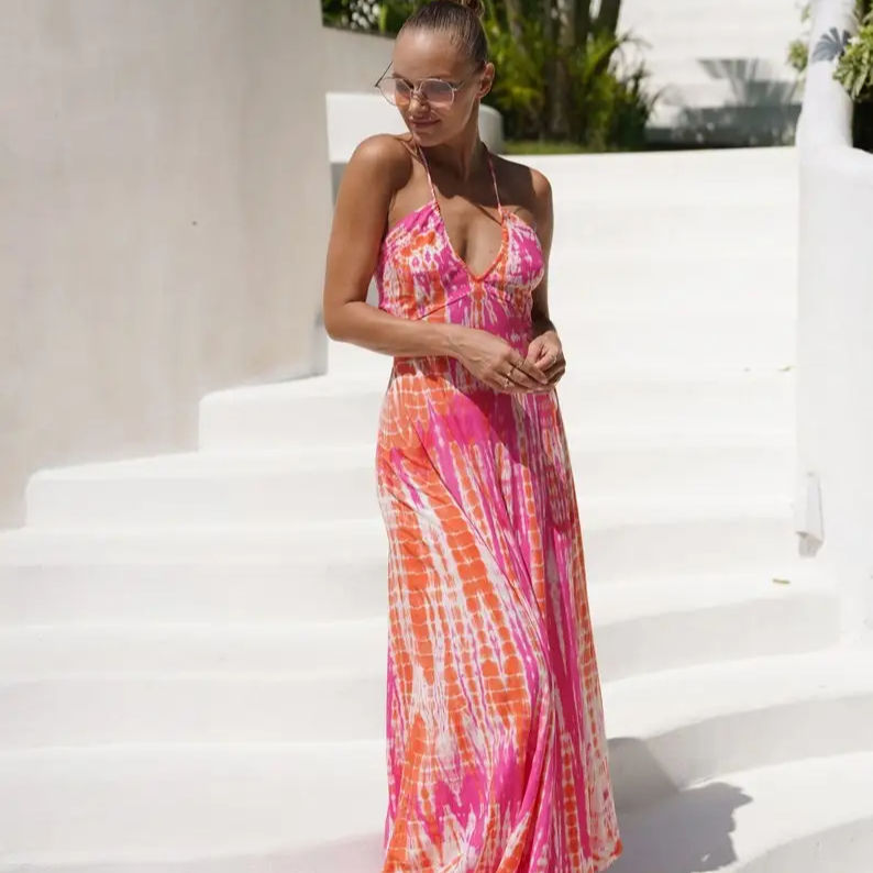 เดรสแม็กซี่ลายมัดย้อม เปิดหลัง ชุดเดรสฤดูร้อน ชุดชายหาดสไตล์โบฮีเมียน ชุดราตรีสำหรับผู้หญิง