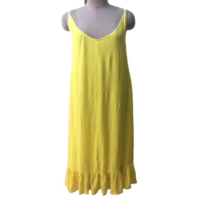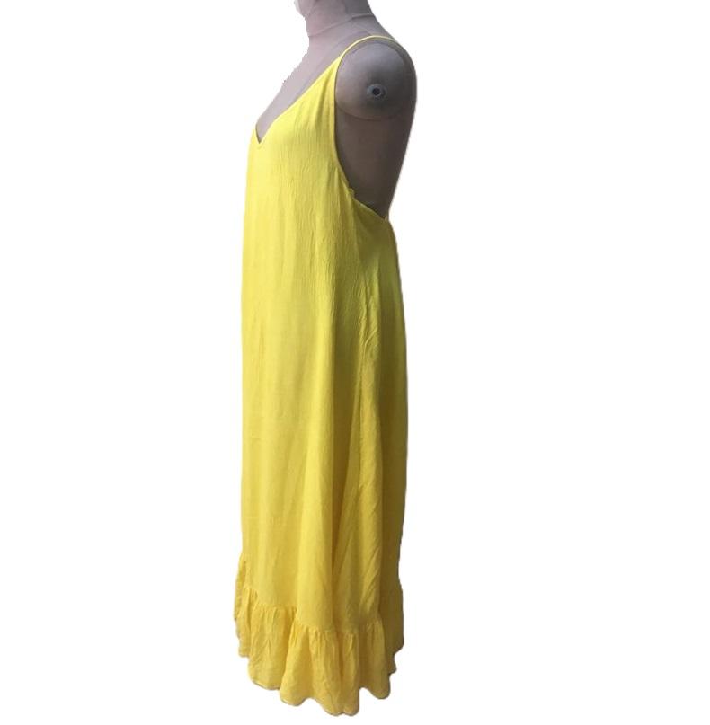 ชุดราตรียาวสายไขว้เปิดหลังสำหรับสุภาพสตรีเดรสสายเดี่ยวสีเหลืองมีจีบขอบด้านล่างเพื่อให้ดูมีระดับ