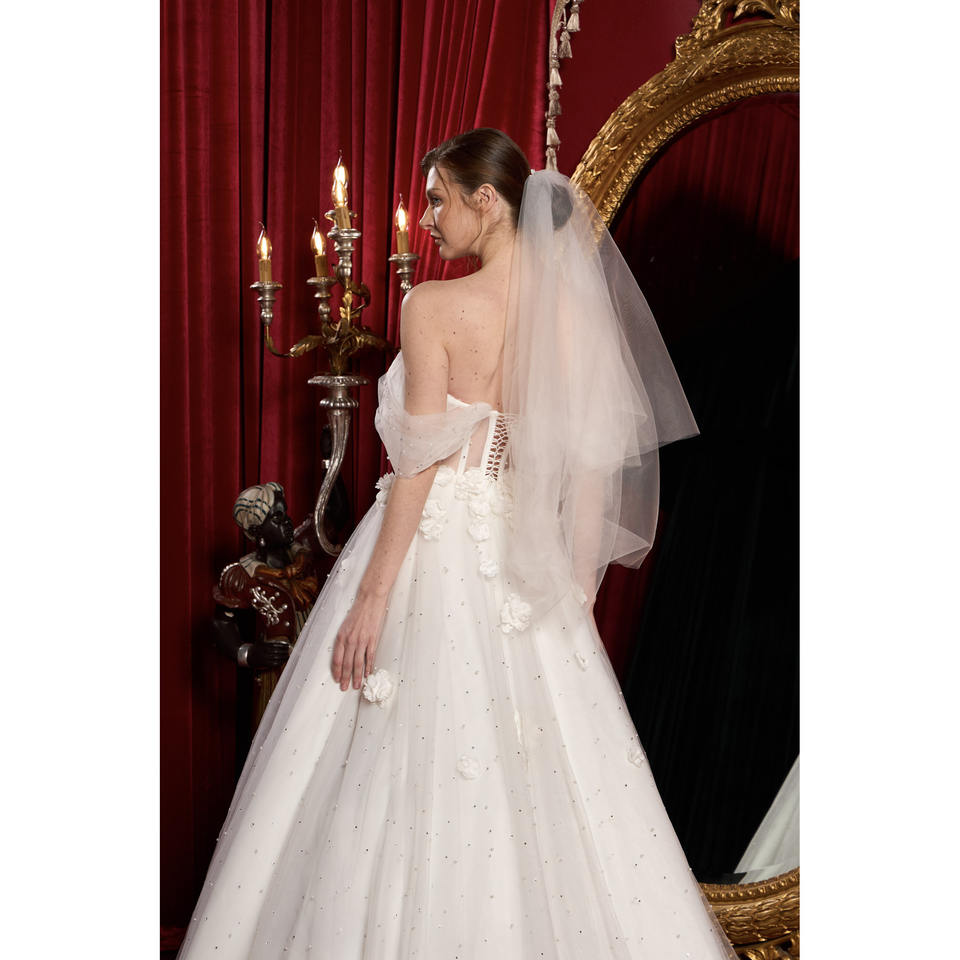 ชุดแต่งงาน Maxi ชุดเดรสพิธีการทางแพ่งพร้อมหินมุกส่องแสงสีขาวและชุดแต่งงานลูกไม้สามมิติ