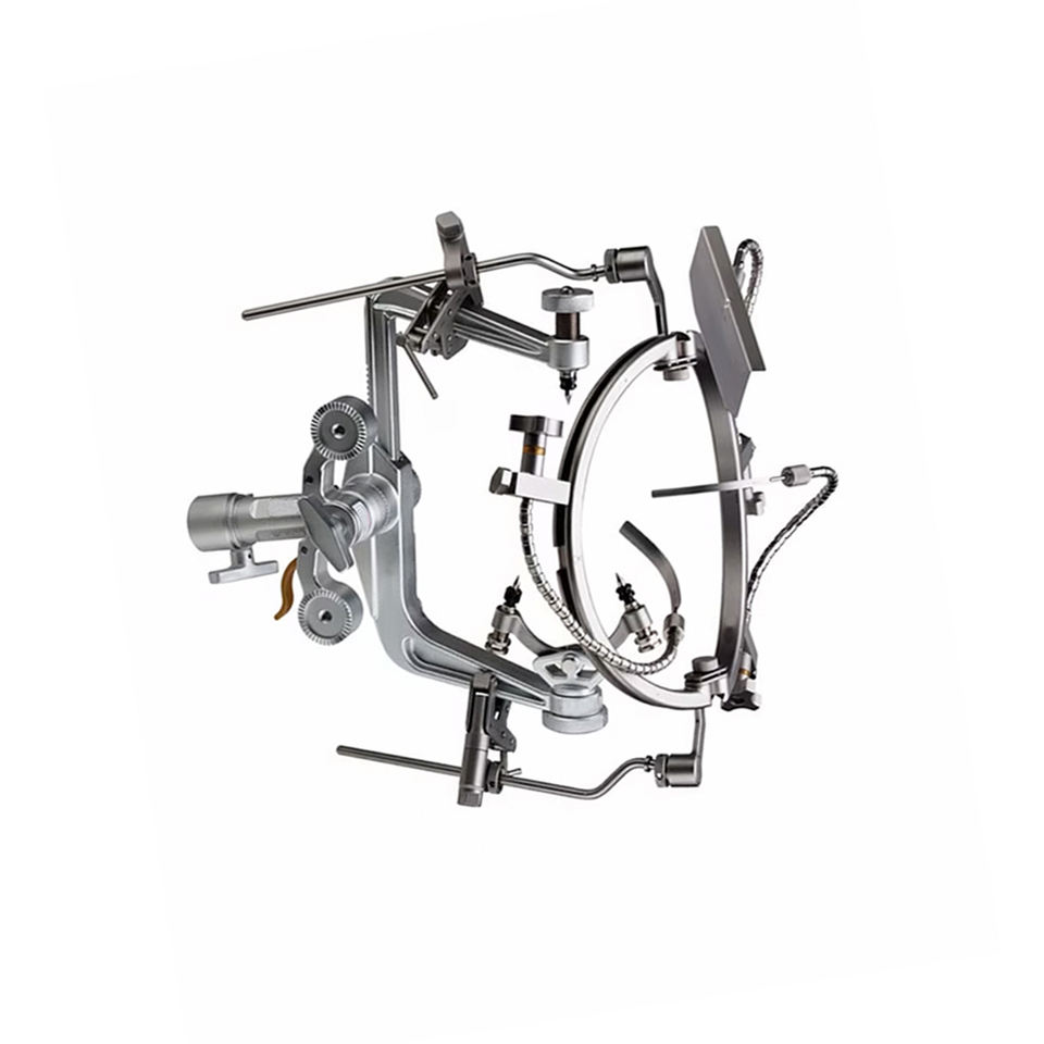 ระบบพยุงศีรษะผ่าตัดแบบแมนนวล Mayfield พร้อมที่หนีบกระโหลก คีมสีดำ และเครื่องมือถ่างกล้ามเนื้อ ทำจากเหล็กและพลาสติก มีจำหน่าย