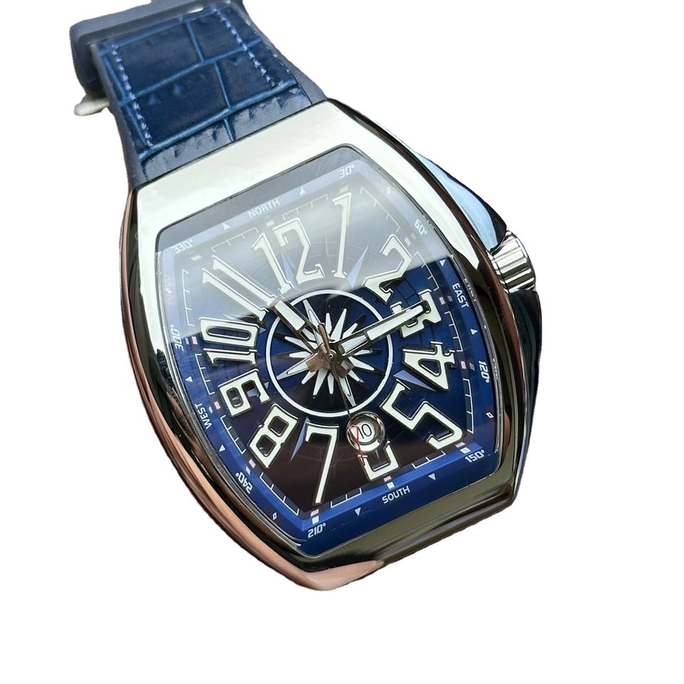 นาฬิกาข้อมือผู้ชายดีไซน์หน้าปัดสีน้ำเงินแบบกลไก สายหนัง กันน้ำ หน้าปัดเรืองแสงแบบโรมัน