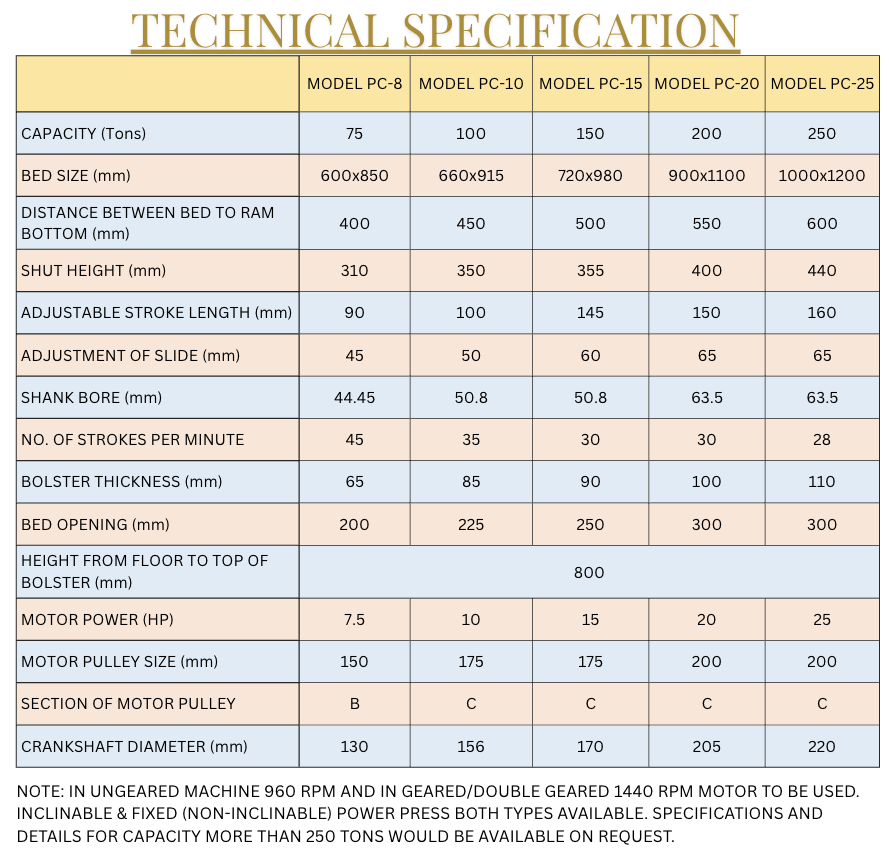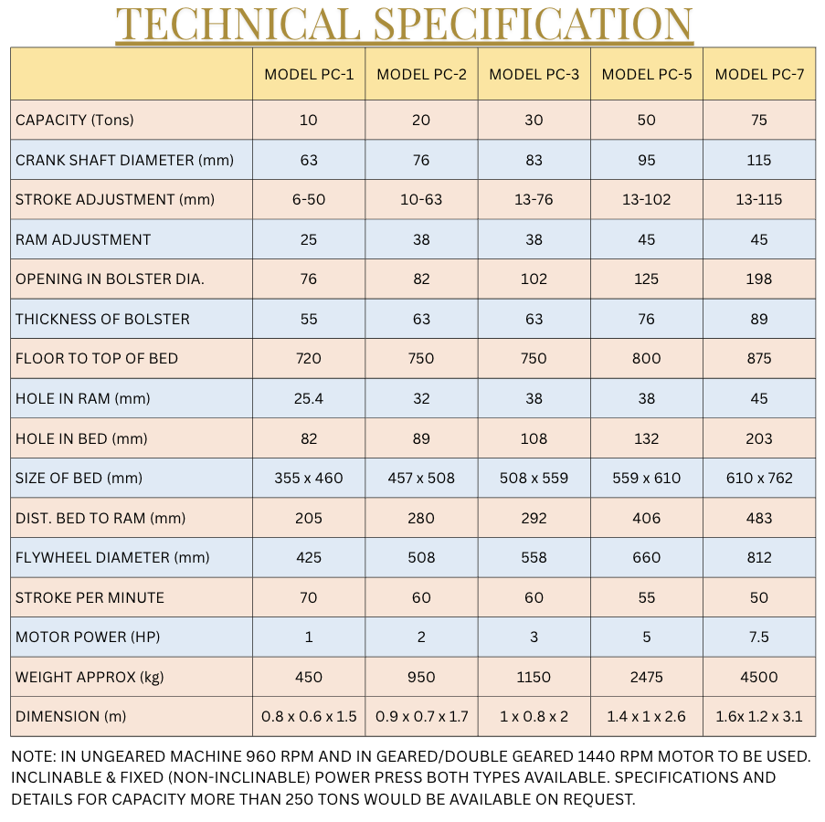 แบริ่ง, เกียร์, มอเตอร์, แคลมป์ยึดแม่พิมพ์และมู่เล่มอเตอร์, ฟลายวีลและแผ่นกันเกียร์, ระบบเคาะออก ตั้งแต่ (10 ตัน ถึง 150 ตัน), ถ้วยน้ำมันสำหรับจุดหล่อลื่น, ประแจปรับสไลด์ (DCX 10 ถึง DCX 150)