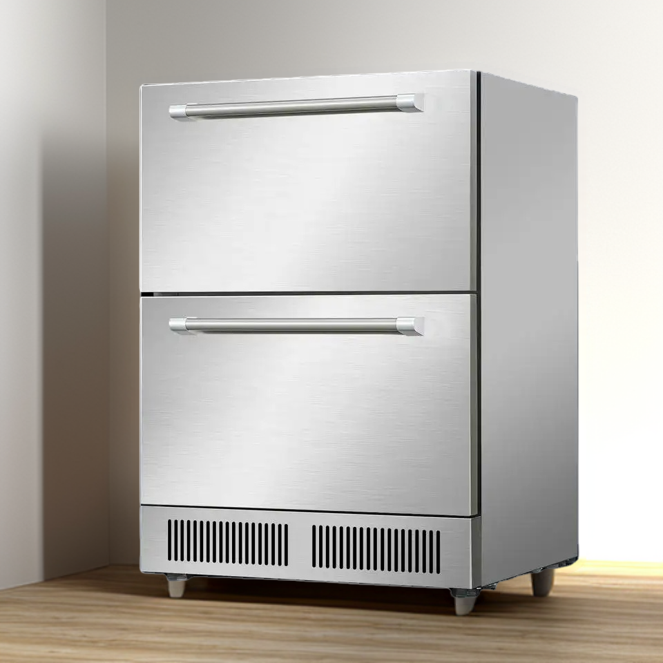 ตู้เย็นแบบลิ้นชักคู่ตู้แช่เครื่องดื่มกลางแจ้งสแตนเลสควบคุมอุณหภูมิเชิงกล