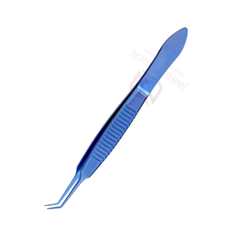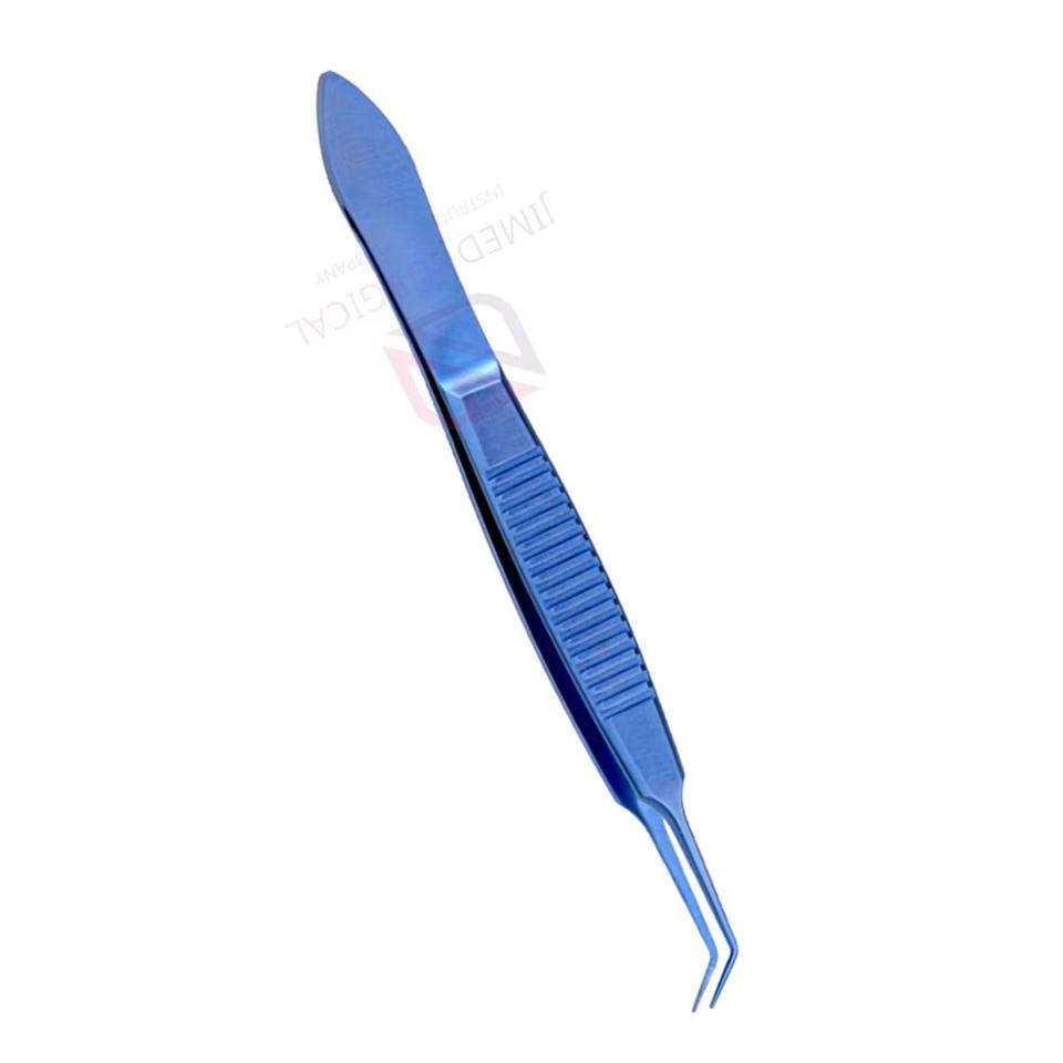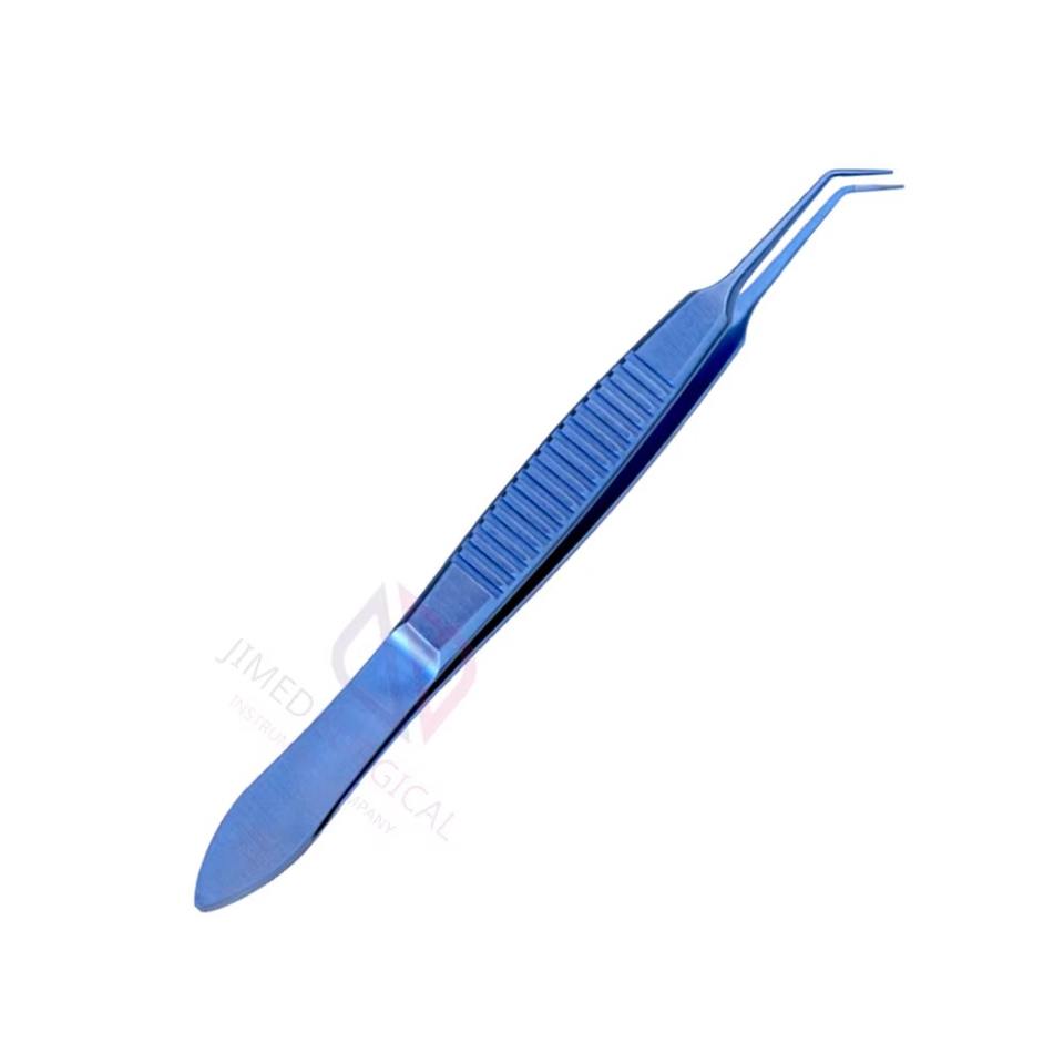 คีมผูกสายตาแบบแมนนวลเคลือบสีน้ำเงินเกรดทางการแพทย์ ทำจากเหล็กกล้าไร้สนิม สำหรับการผ่าตัดจุลศัลยกรรมตา มีมุมโค้ง ใช้งานได้อย่างแม่นยำ ได้รับมาตรฐาน CE