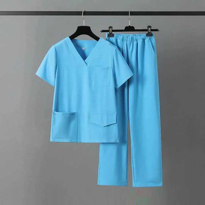 เสื้อสครับทางการแพทย์แขนสั้นคอวีแบบนิ่มสำหรับทุกเพศพร้อมการตรวจจับเข็มเชื่อมกันอย่างไร้รอยต่อสำหรับใช้ในโรงพยาบาล