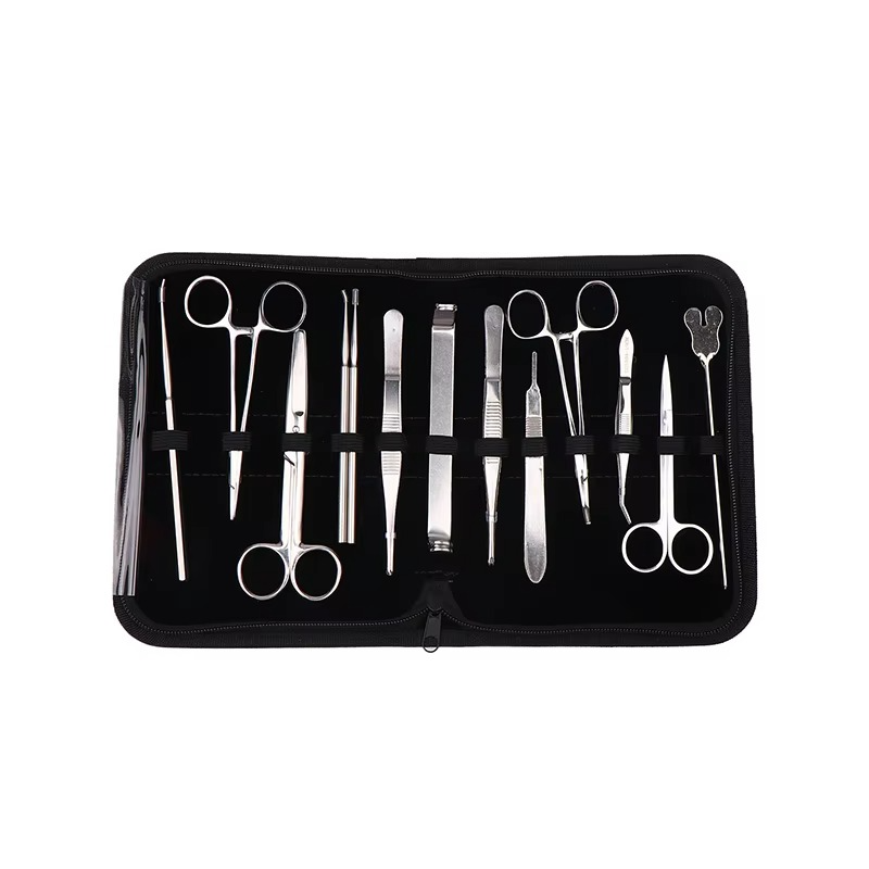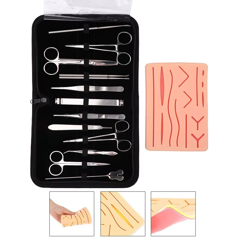 ชุดฝึกเย็บแผลสำหรับนักเรียนทางการแพทย์ชุดอุปกรณ์ฝึกฝนการผ่าตัดพร้อมแผ่นรองผิวซิลิโคนชุดเครื่องมือคีมแบบกำหนดเองซัพพลายเออร์