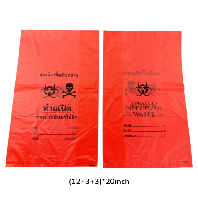 ถุงขยะมูลป่วยทางการแพทย์แบบม้วน ถุงขยะอันตรายทางชีวภาพ ขนาด 20 นิ้ว ปรับแต่งได้ ผลิตจาก HDPE แบบใช้แล้วทิ้ง สีแดง พร้อมเชือก PP สำหรับรัดปากถุง โรงพยาบาล ปลอดเชื้อ มาตรฐาน ISO