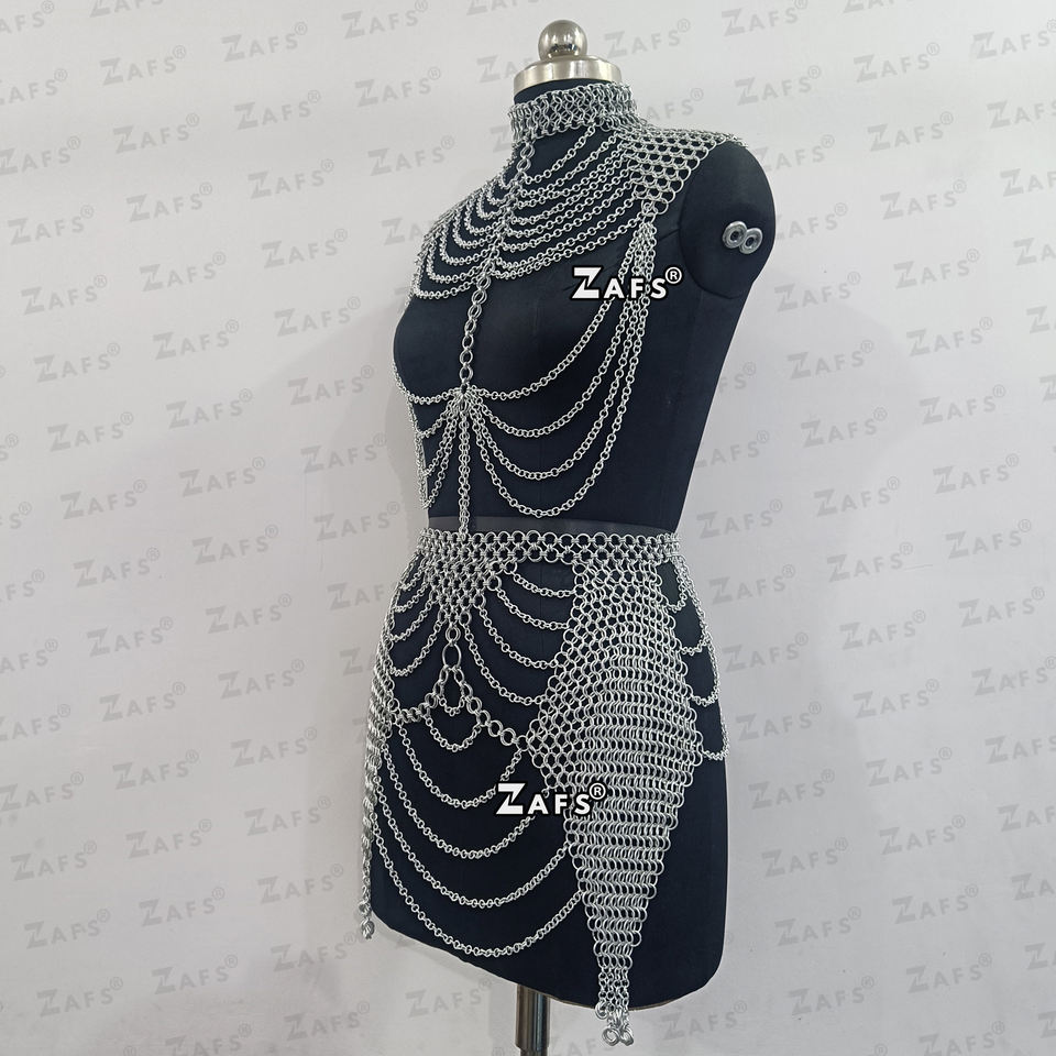 ชุดกระโปรงคอสเพลย์โซ่ติดคอปกยุคกลางสำหรับผู้หญิงทำจากอลูมิเนียมงานแฮนด์เมดเทคนิคขัดเงา