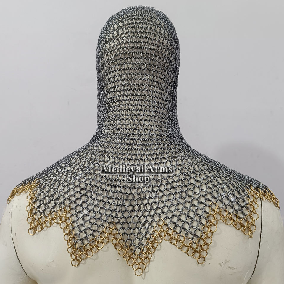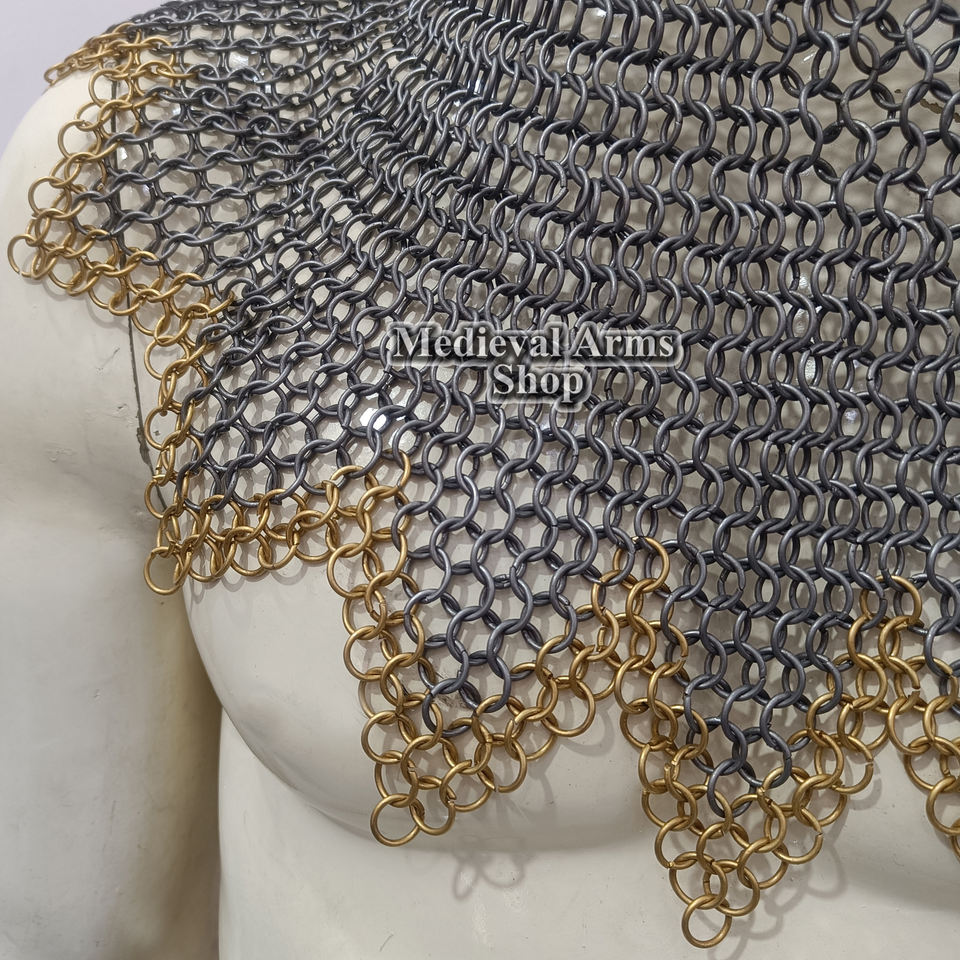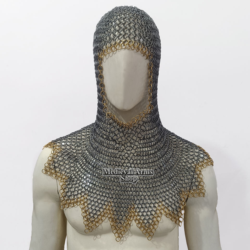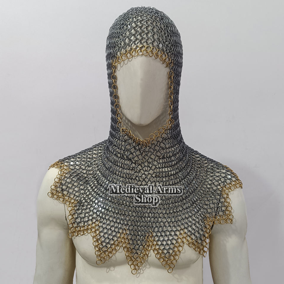 ชุดเกราะเหล็กยุคกลางแบบโซ่ พร้อมฮู้ดลายซิกแซก ตกแต่งด้วยห่วงทองเหลือง คุณภาพพรีเมียม สำหรับคอสเพลย์ การแสดงบทบาทสมมติ และยุคสมัยประวัติศาสตร์