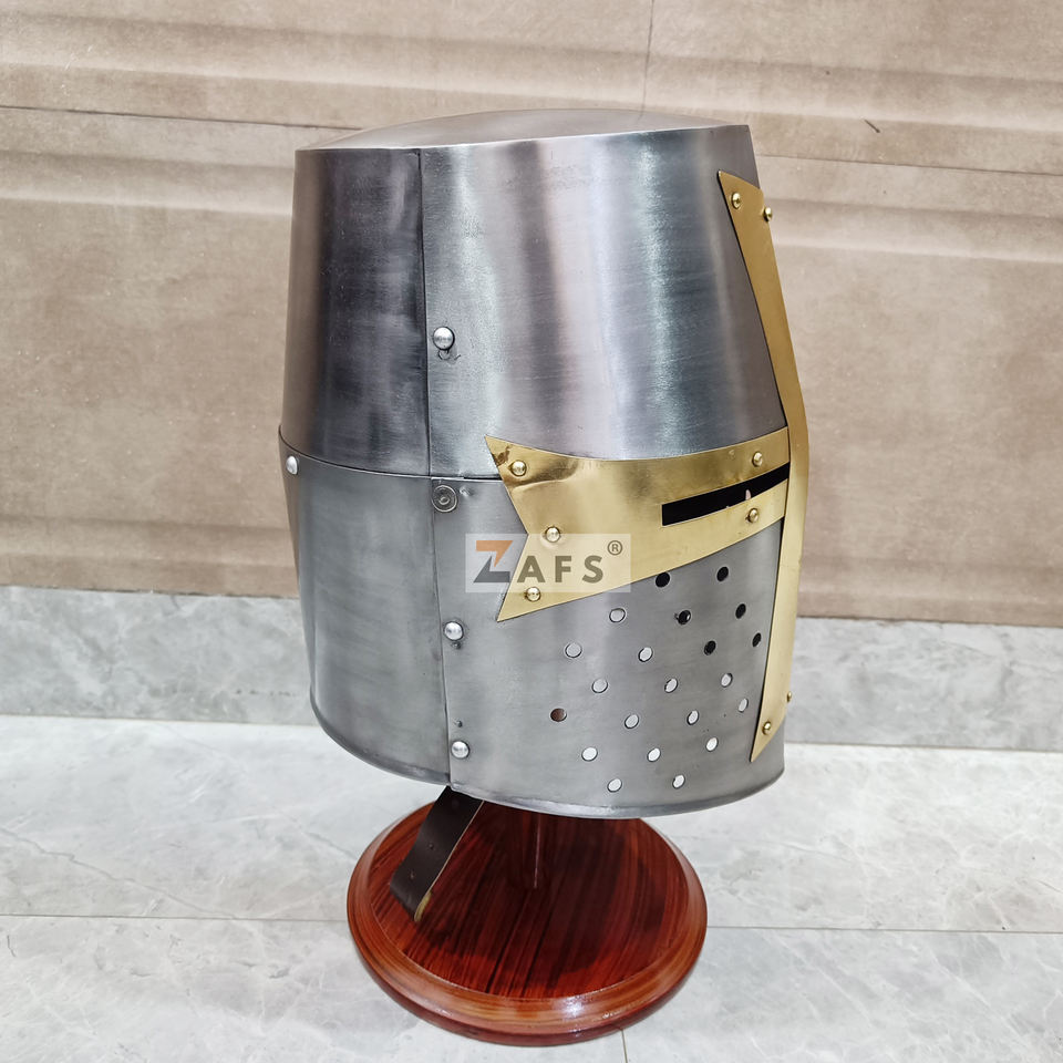 หมวกกันน็อคนักรบครูเสดยุคกลางพร้อมไม้กางเขนทองเหลืองแบบอ่อนหมวกเกราะอัศวินเทมพลาร์แบบโชว์คอสเพลย์เป็นของสะสม