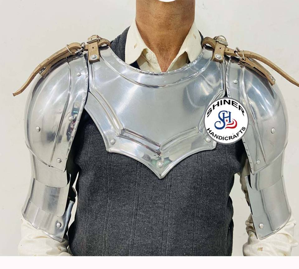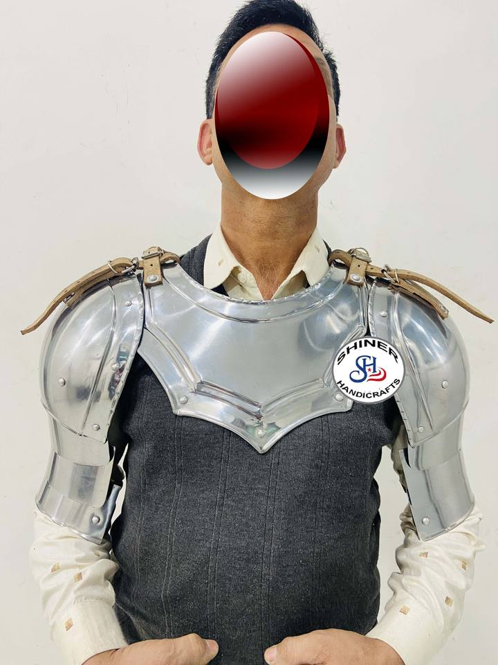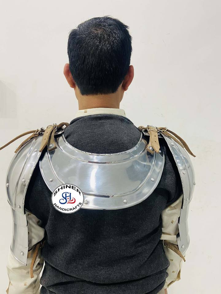 ชุดเกราะอัศวินยุคกลางชุดพอลโดรนและคอเหล็กสำหรับคอสเพลย์ชุดเกราะฮาโลวีนขัดเงาสีเงิน