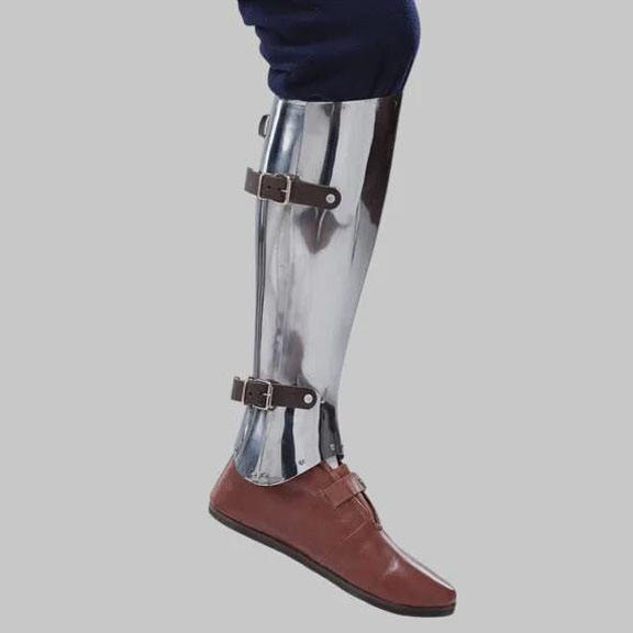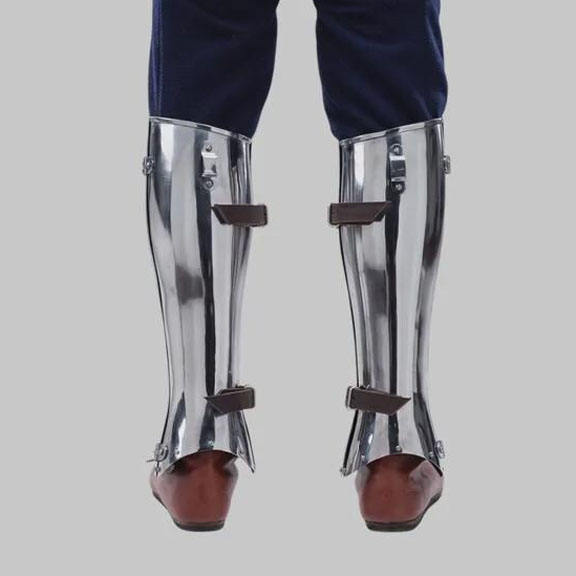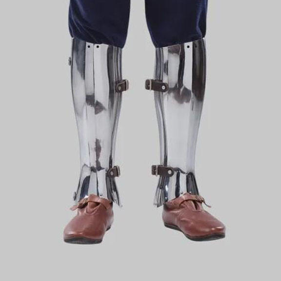 เกราะอัศวินยุคกลางที่มีขาแบบบานพับปิดปกป้องด้วยเหล็กขัดเงาสำหรับงานฝีมือโลหะและคอสเพลย์
