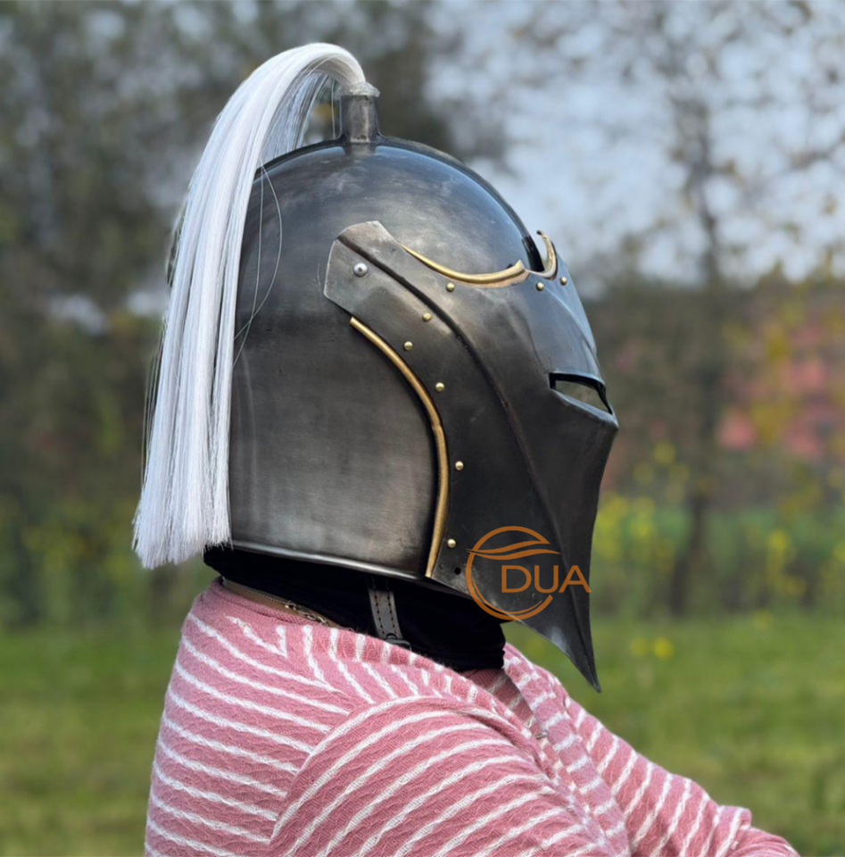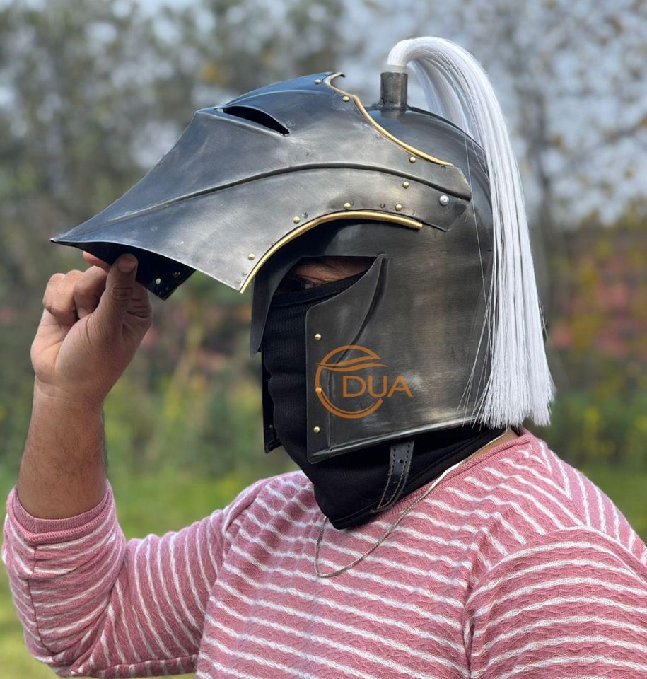 หมวกเหล็กนักรบยุคกลางแบบเต็มหน้า ชุบดำขัดเงา พร้อมช่องตา ตกแต่งด้วยทองเหลืองประดับขนนกสีขาว สำหรับฮาโลวีน