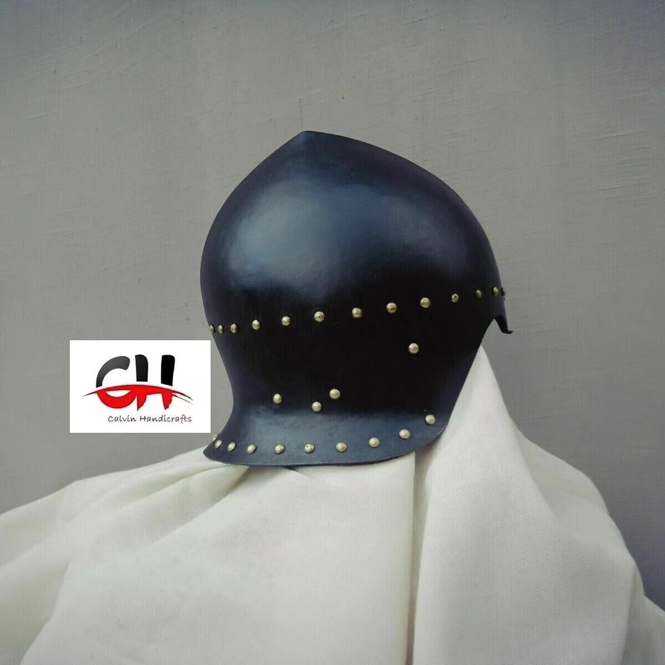หมวกนิรภัยเหล็กกล้าอัศวินยุคกลางสีดำสร้างขึ้นใหม่โดยหัตถกรรม Calvin