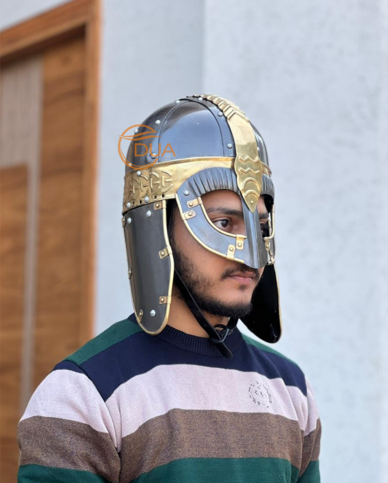 หน้ากากไวกิ้งยุคกลางของนอร์เวย์ หมวกเหล็กเกราะแท้ รุ่น Gjermundbu ชุบทอง-เทา สำหรับวันขอบคุณพระเจ้าและคริสต์มาส