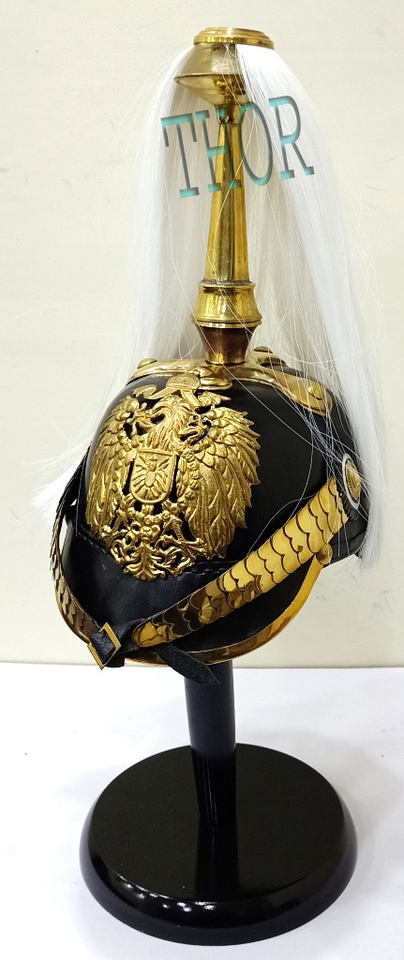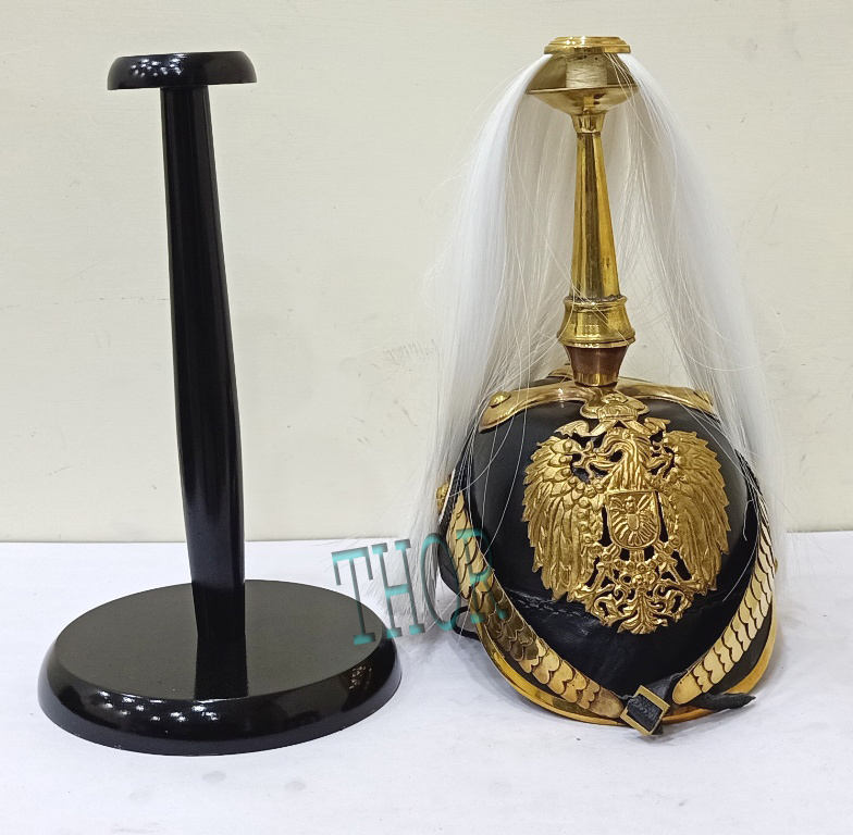 Pickelhaube หมวกกันน็อคหนังเยอรมันยุคกลางพร้อมขาตั้งไม้