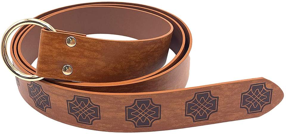 เข็มขัดไวกิ้งยุคกลางสำหรับผู้ชายแหวนหนัง PU นูนลายอัศวินยุคฟื้นฟูศิลปวิทยาสีน้ำตาล BG43ขนาด65นิ้ว