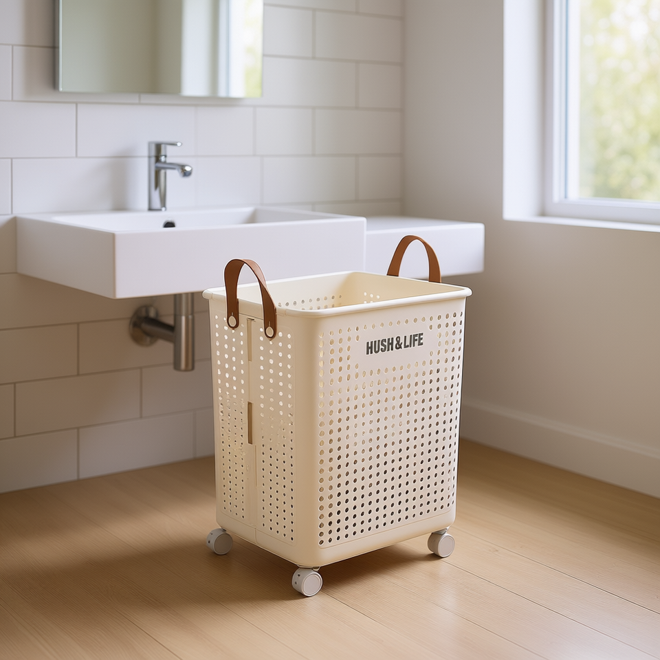 ตะกร้าผ้าพับได้ XL สีครีม รูปทรงสี่เหลี่ยมผืนผ้า พร้อมล้อ สำหรับจัดเก็บในห้องน้ำ