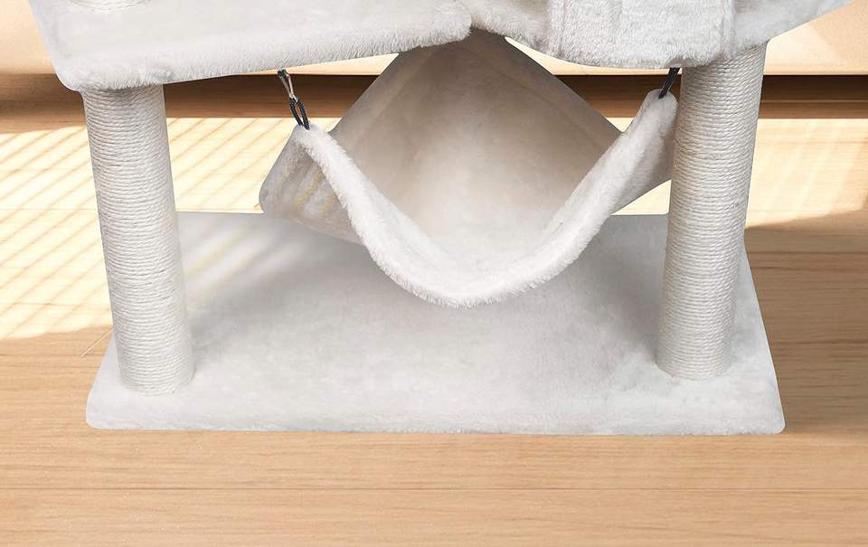 ต้นไม้แมวแบบโมเดิร์นขนาดกลาง ทำจากไม้ วัสดุกระดาษใยไซซอล พร้อมคอนโดแมวและเปลญวนขนาดใหญ่ บรรจุในกล่อง ที่ลับเล็บแมว